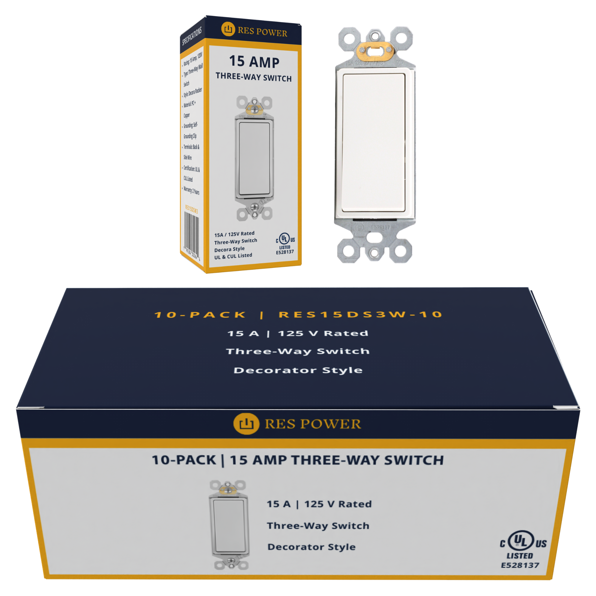 RES POWER RES15DS3W 15A 125V Decorator Style Three -Way Switch AC , 125V, self-grounding, white, residential grade, cULus listed.