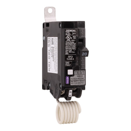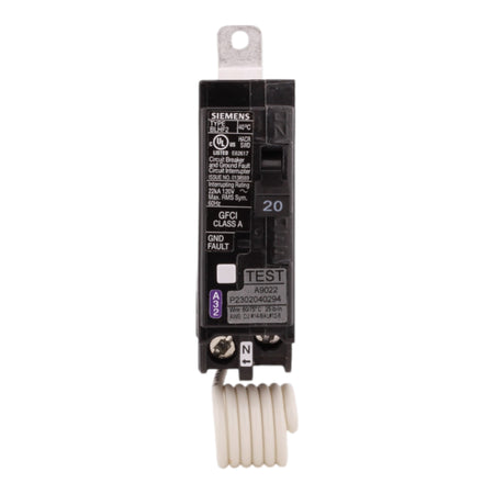 Siemens US2:BF120AH: 20 Amp 1-Pole Ground-Fault Circuit Interrupter breaker, 120V, 22kA, pigtail neutral, 5mA trip sensitivity, UL listed.