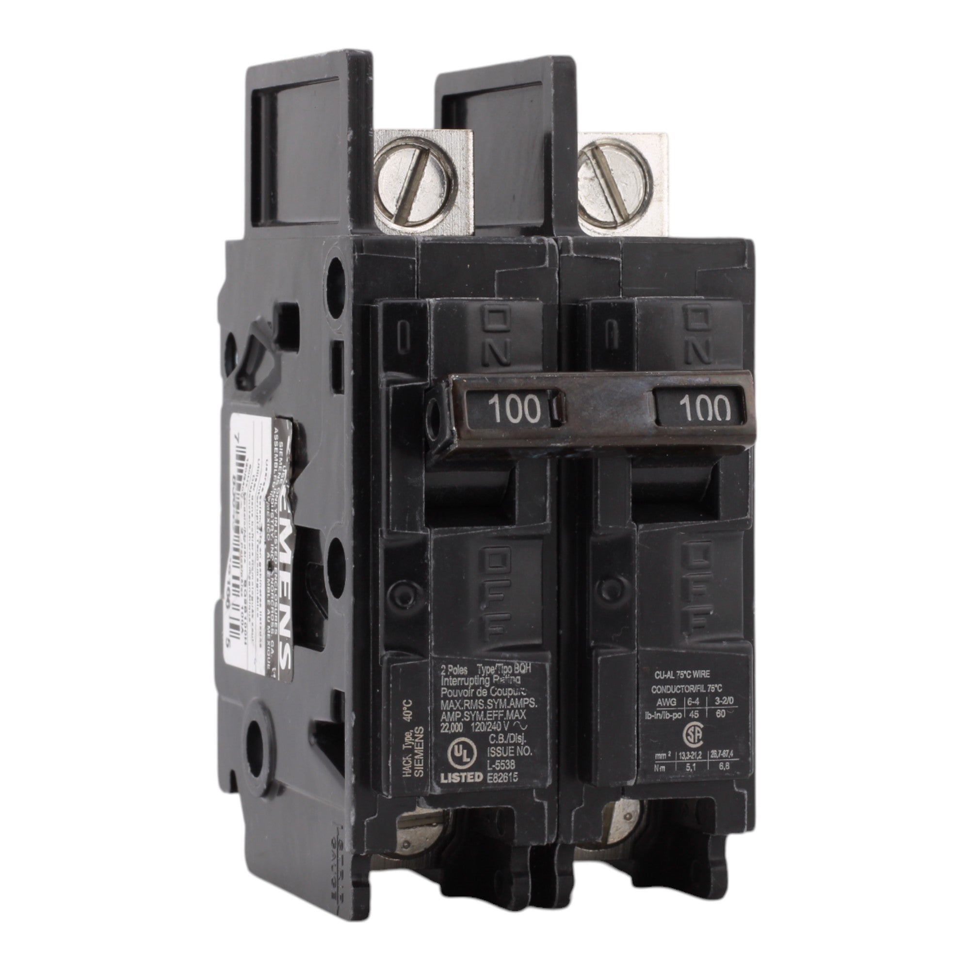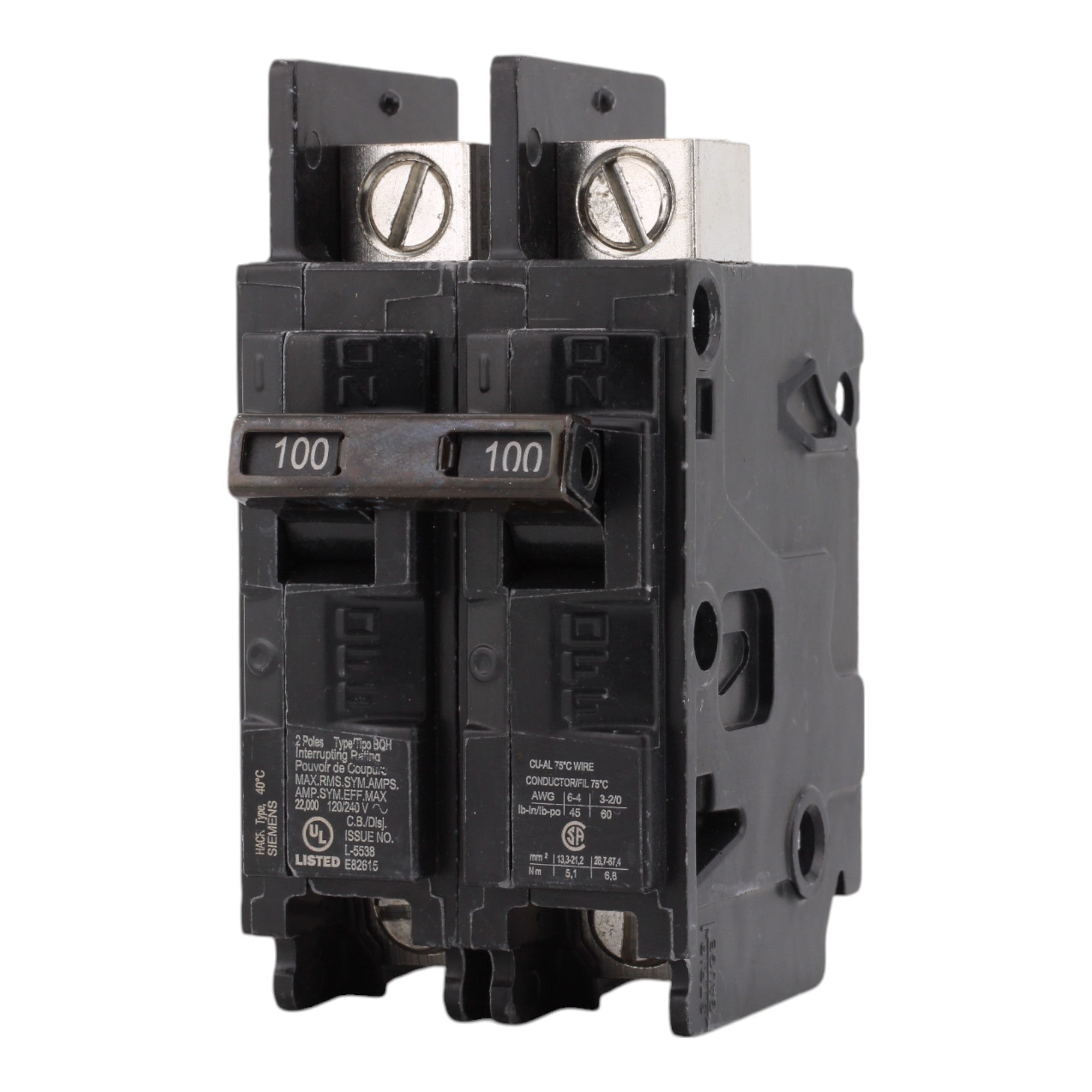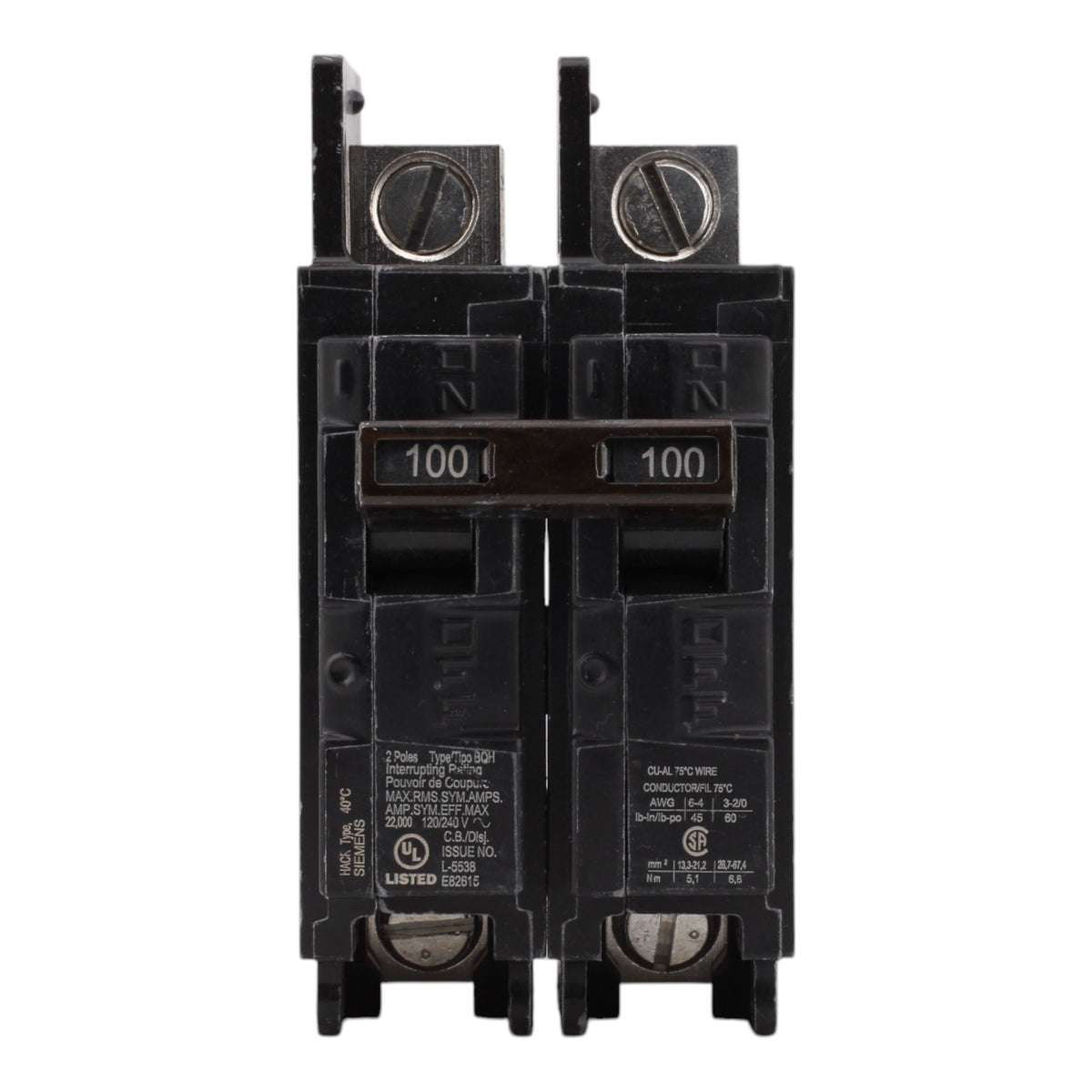 Siemens BQ2B100H, 100A, 120/240V, 2-Pole, Molded Case Circuit Breaker, Common Trip, 22kA Interrupt Rating, Load Side Lugs Included