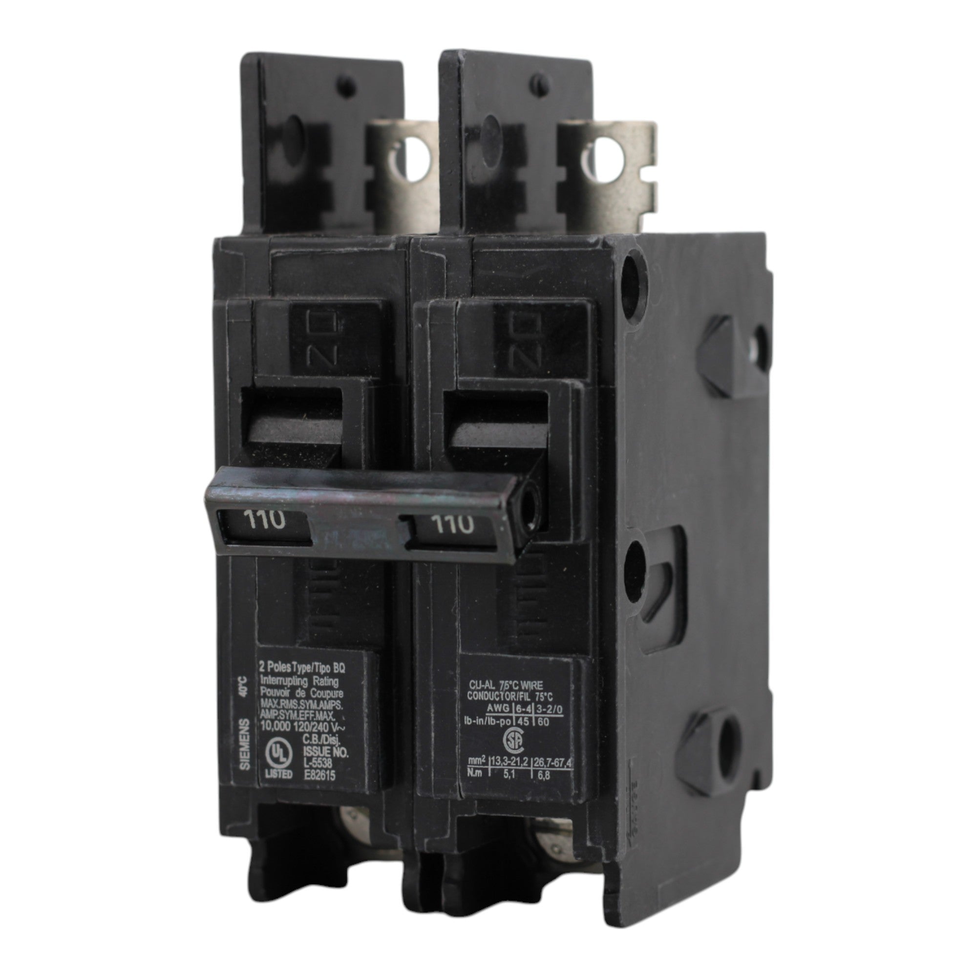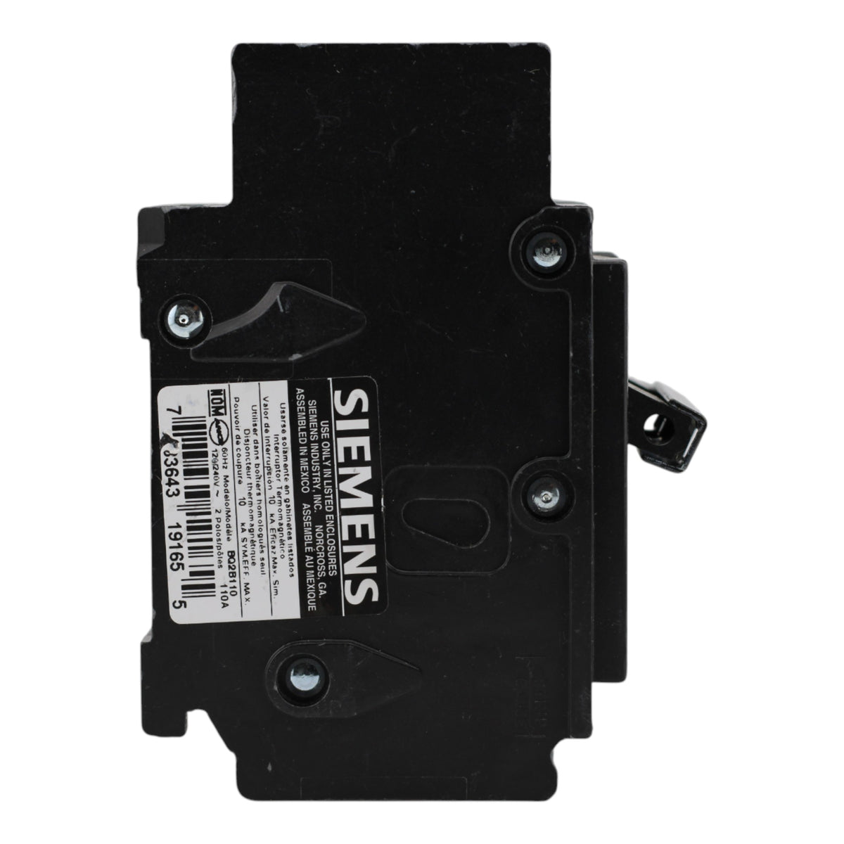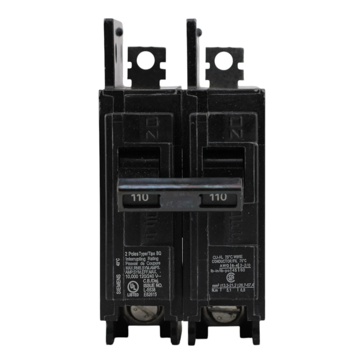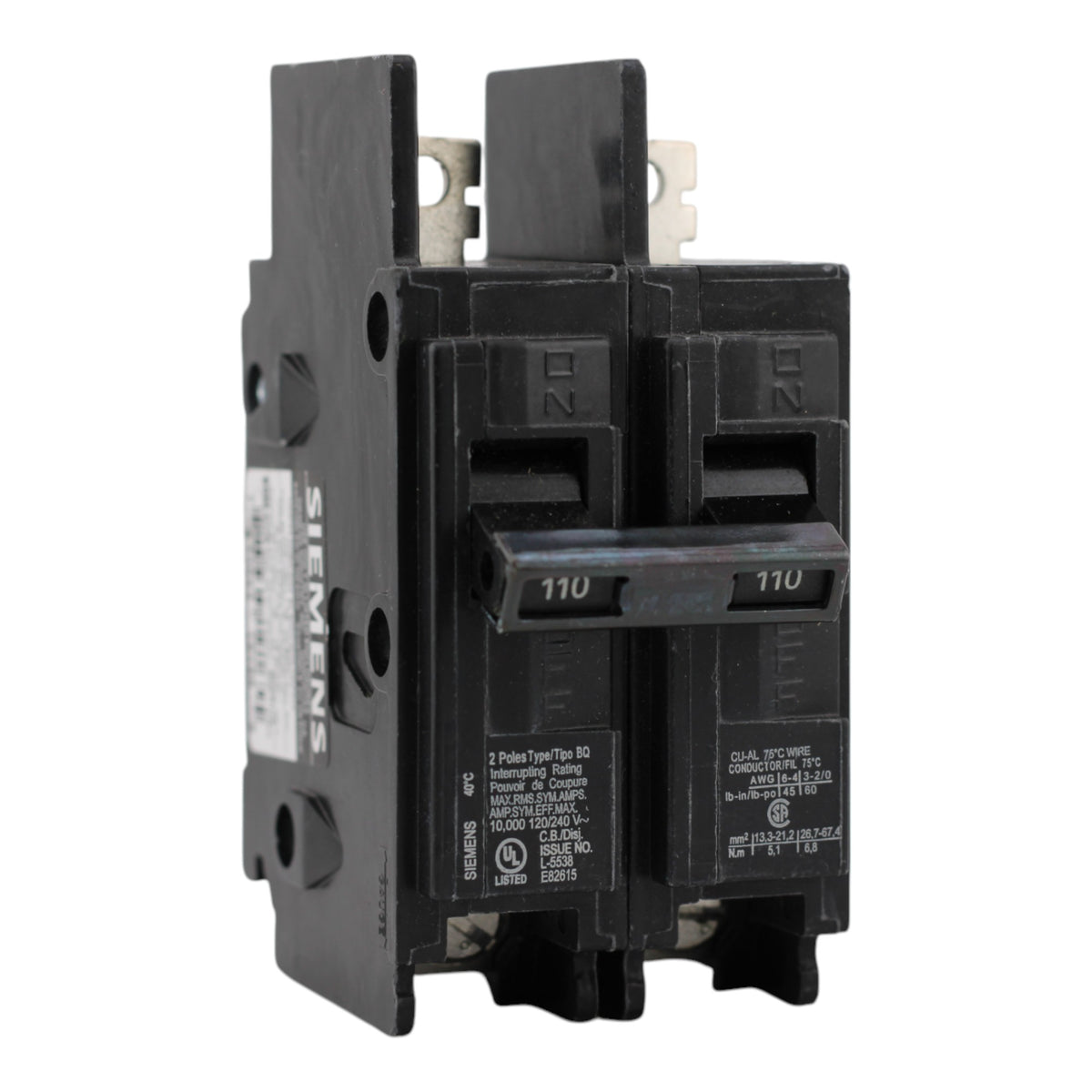 Siemens BQ2B110: 110A 2P molded case circuit breaker, 120/240V, 10kA interrupt rating, common-trip design, load side lugs included, UL listed for general purpose applications.
