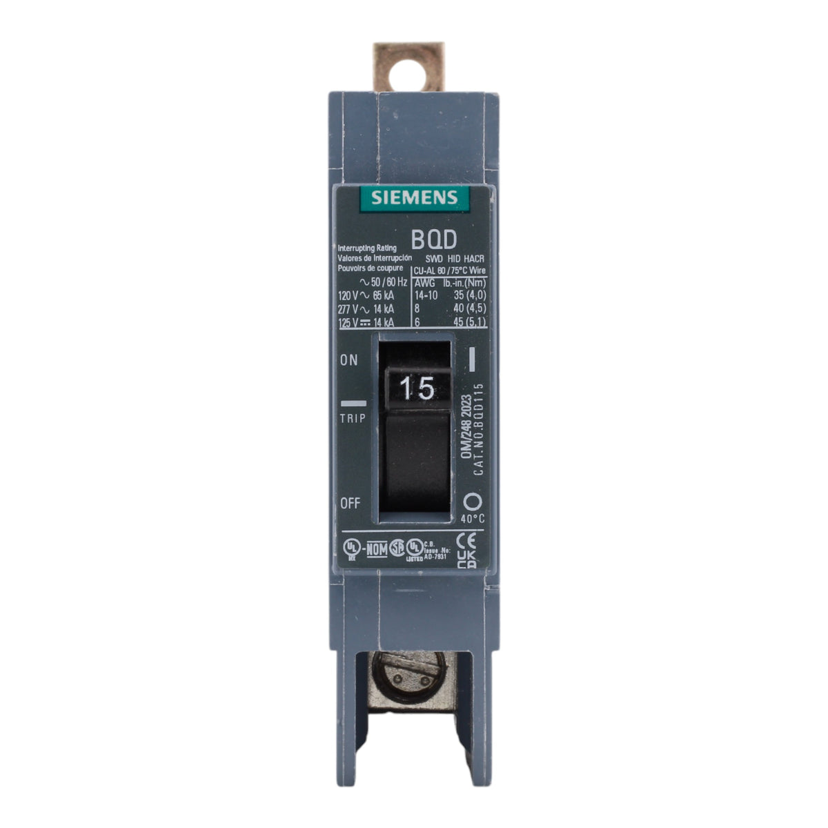Siemens BQD115, 15A, 277V, 1-Pole Molded Case Circuit Breaker, Thermal Magnetic, 14kA Interrupt Rating
