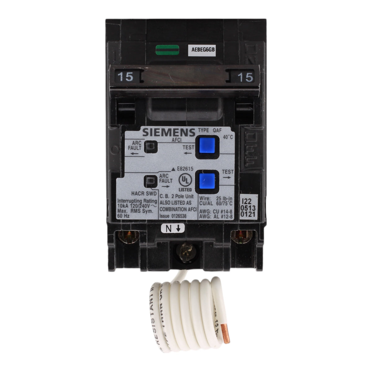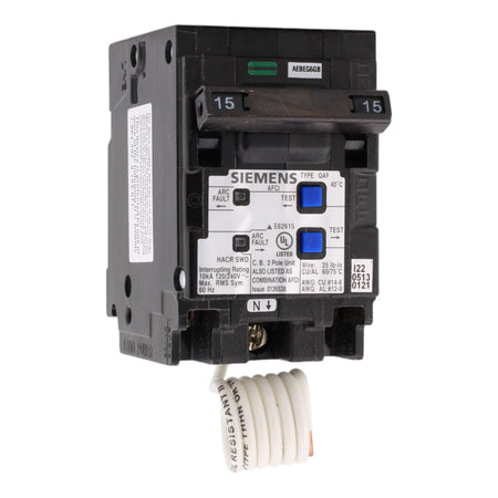The Siemens Q215AFC is a dependable 15 Amp, 120/240 Volt, double-pole combination arc fault circuit breaker (AFCI) designed for use in Siemens panels. This breaker features a plug-in mount and a pigtail connection for easy installation and reliable performance. It provides advanced arc fault detection to protect against hazardous electrical conditions and prevent potential fire risks. With an interrupt rating of 10kA and 22kA, the Q215AFC is UL Listed, ensuring it meets safety and performance standards for residential electrical systems.