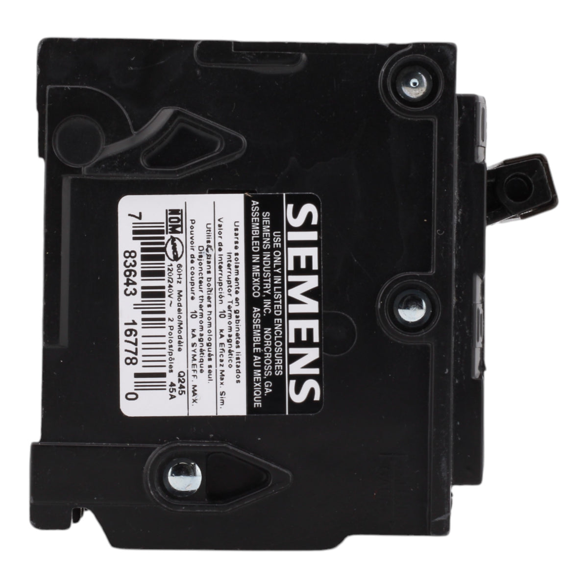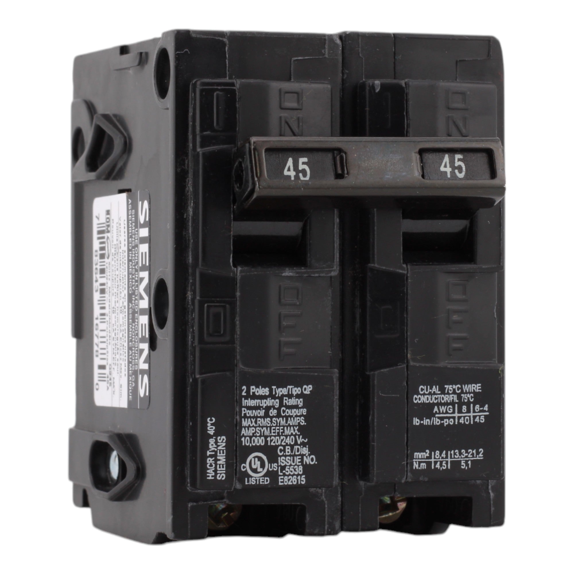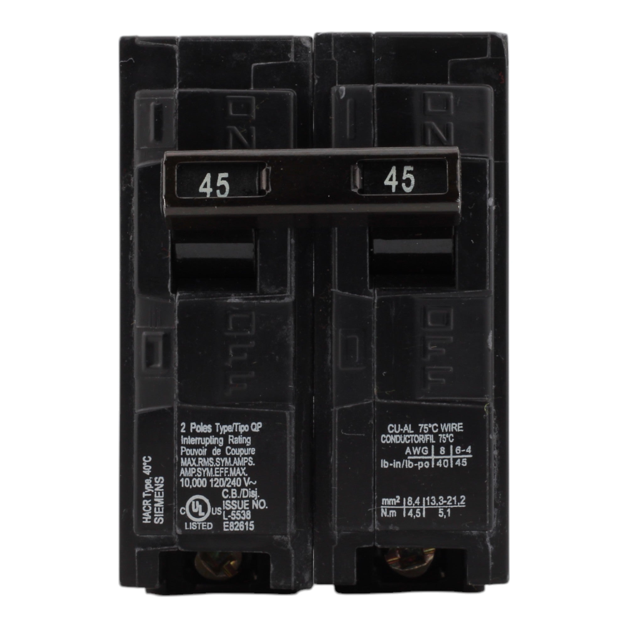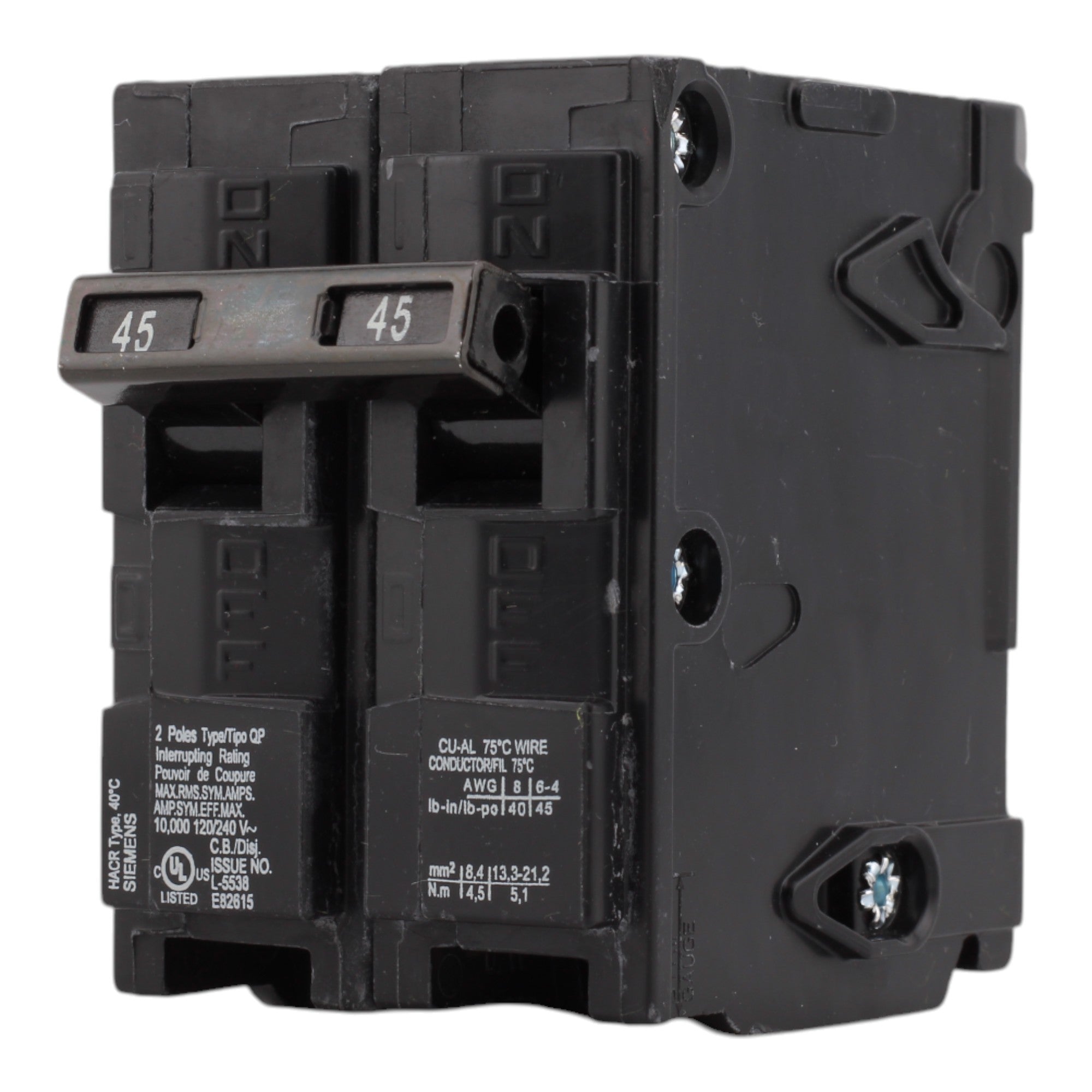 Siemens Q245 45A 120/240V 2-Pole Thermal Magnetic Circuit Breaker, Plug-In, 10kA Interrupt, Type QP