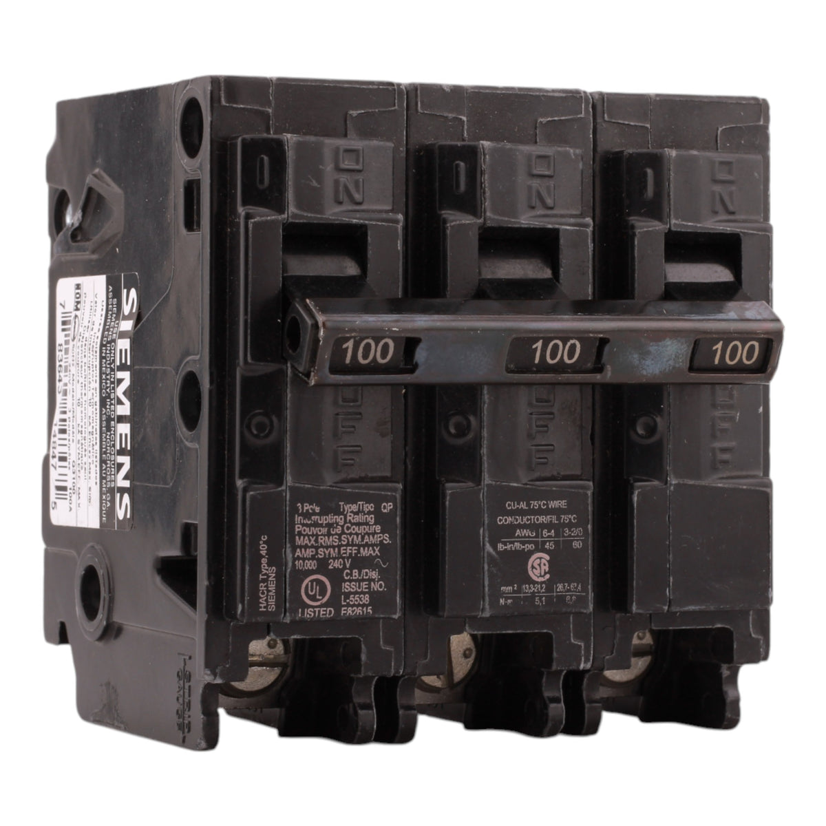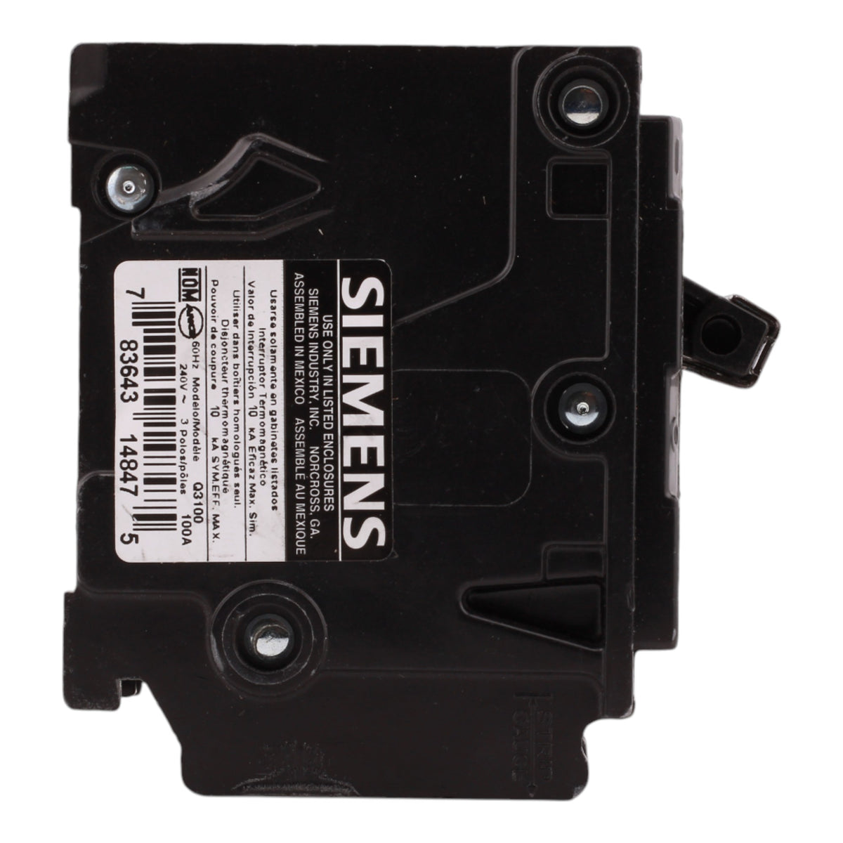 Siemens Q3100: 100A 3P thermal-magnetic breaker, 240V, 10kAIC rating, QP/MP type for electrical distribution, UL 489 listed, for residential applications in Siemens loadcenters, plug-in mount.