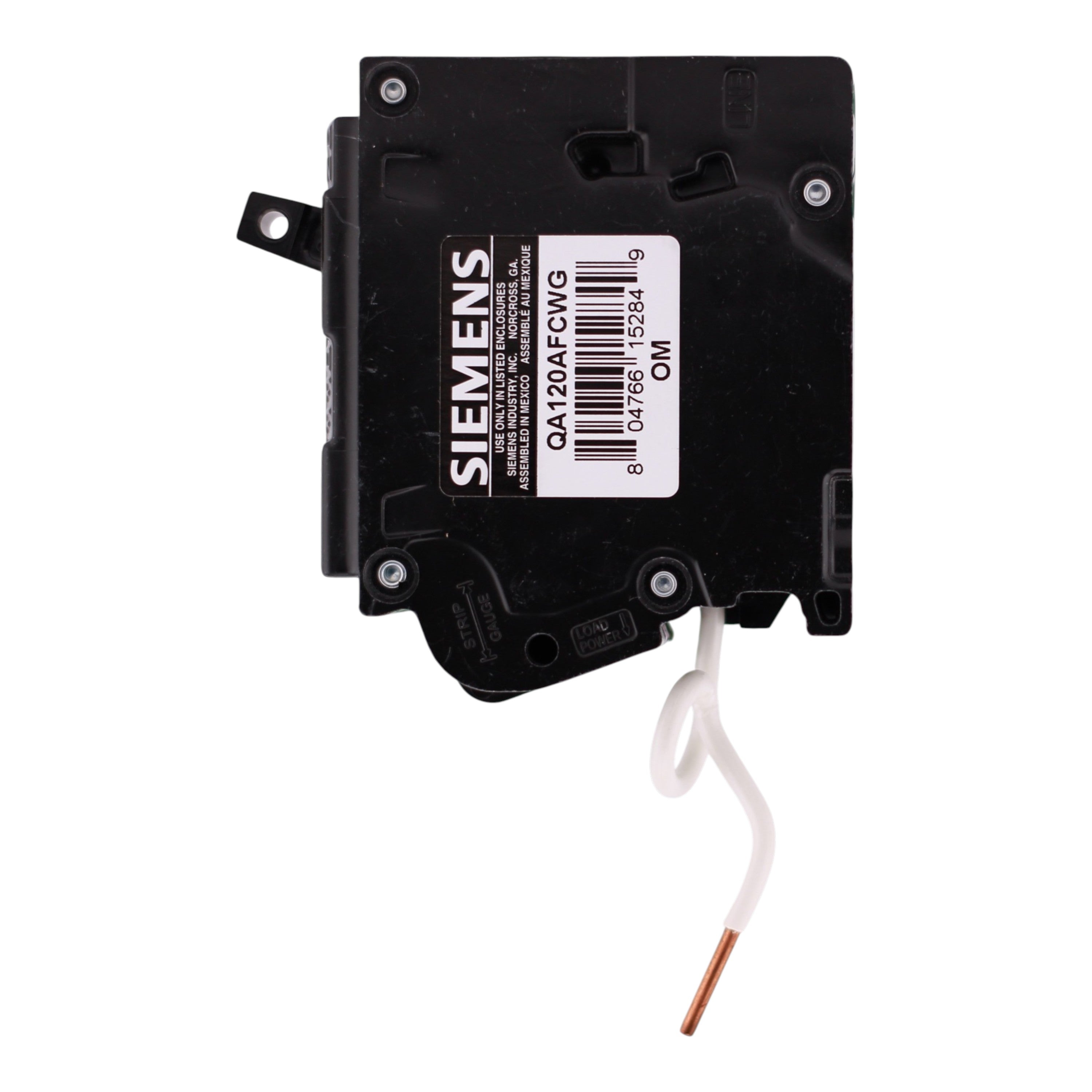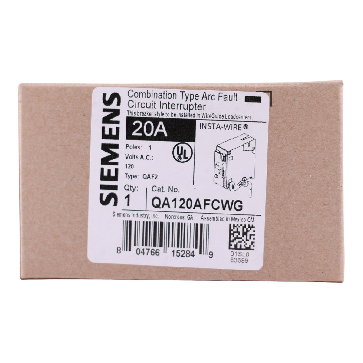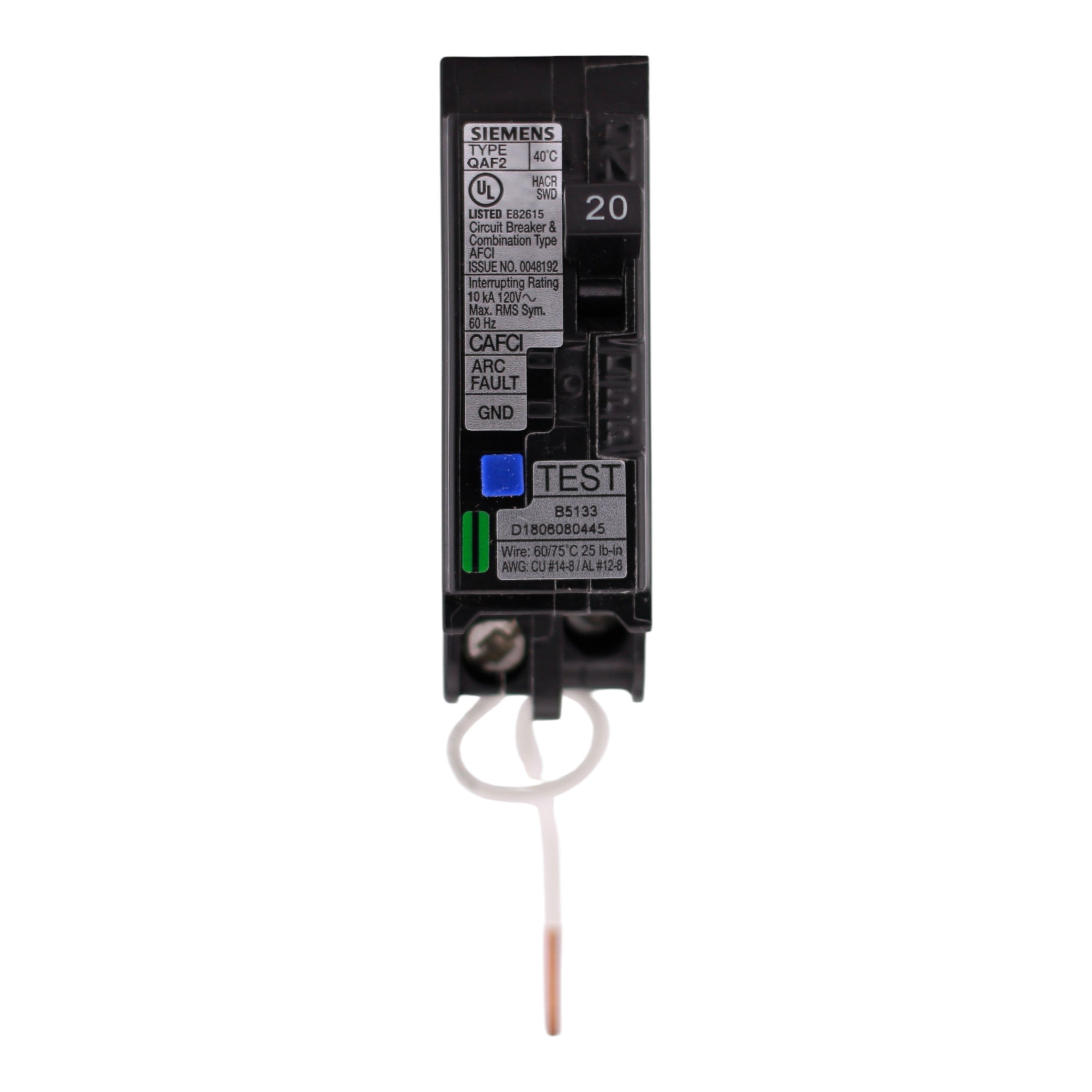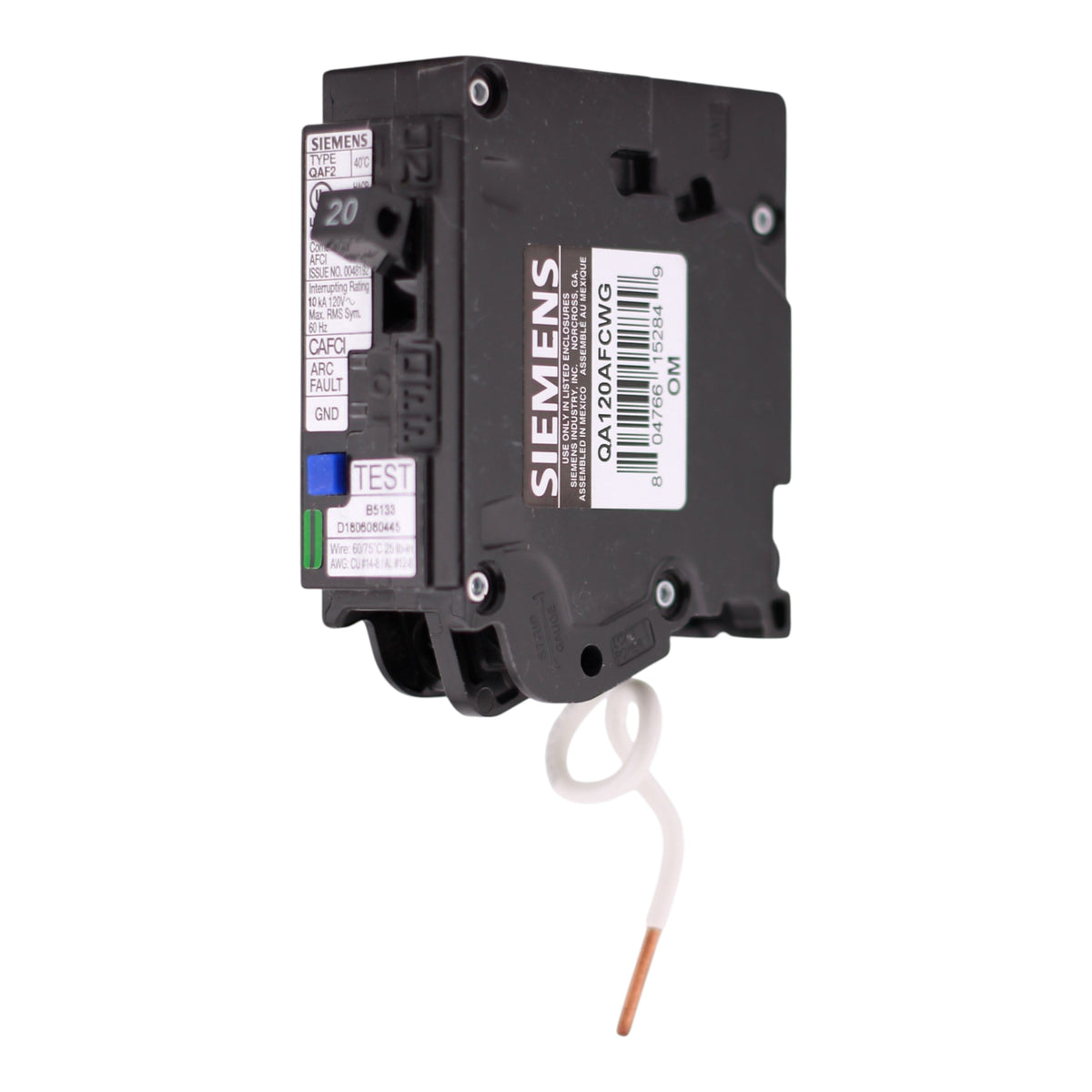 Siemens QA120AFCWG: 20 Amp, 1-Pole, Combination AFCI Arc-Fault Circuit Interrupter breaker, 120V, 10kA, pigtail neutral (WireGuide), 5mA trip sensitivity, UL Listed.
