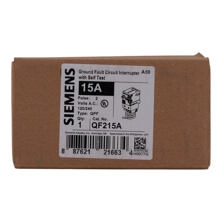 Siemens QF215A: 15 Amp 2-Pole GFCI Ground-Fault Circuit Interrupter breaker, 120/240V, 10kA interrupt rating, plug-on mounting, 5mA trip sensitivity, UL listed