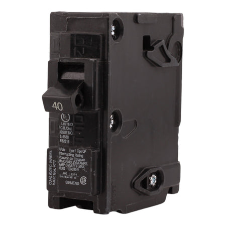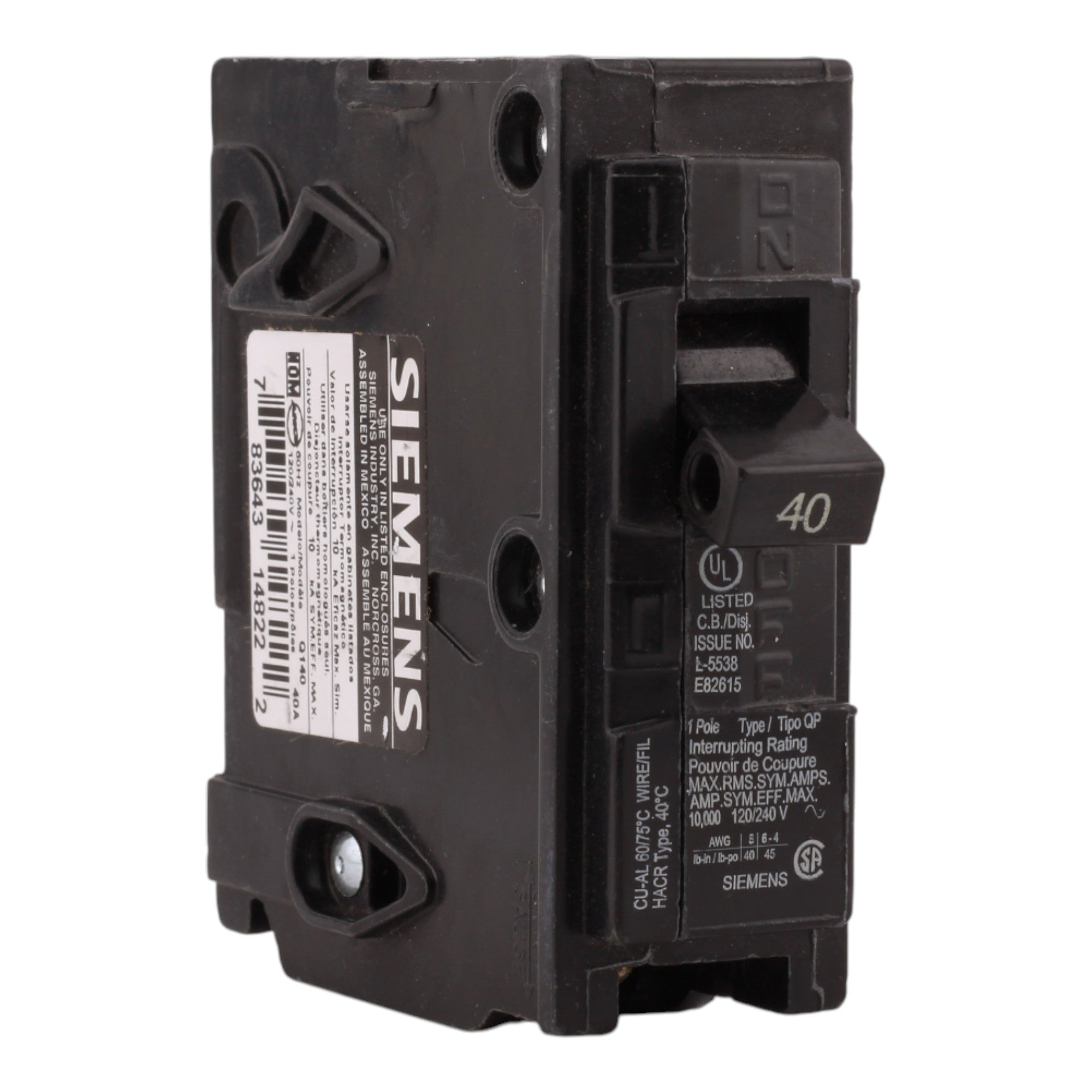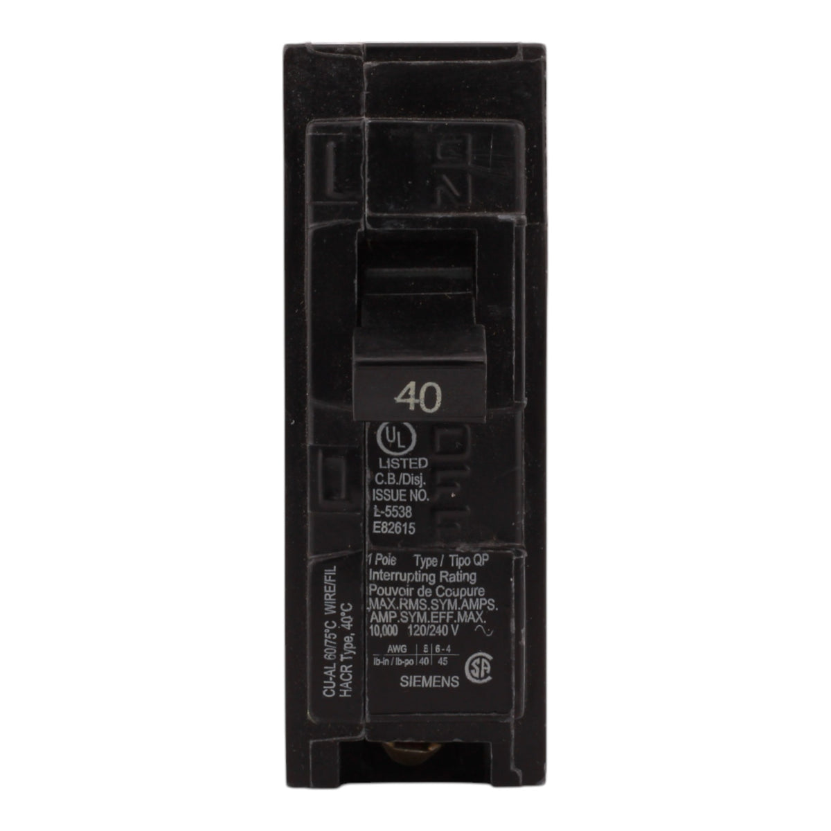 Siemens Q140: 40 Amp 1-Pole Thermal Magnetic Circuit Breaker, 120V, 10kA interrupt rating, Type QP series, UL 489 compliant.