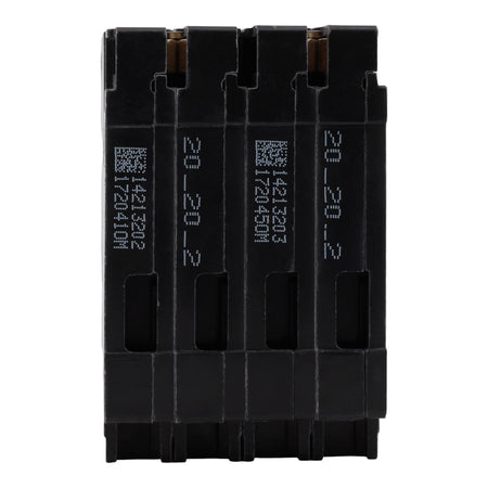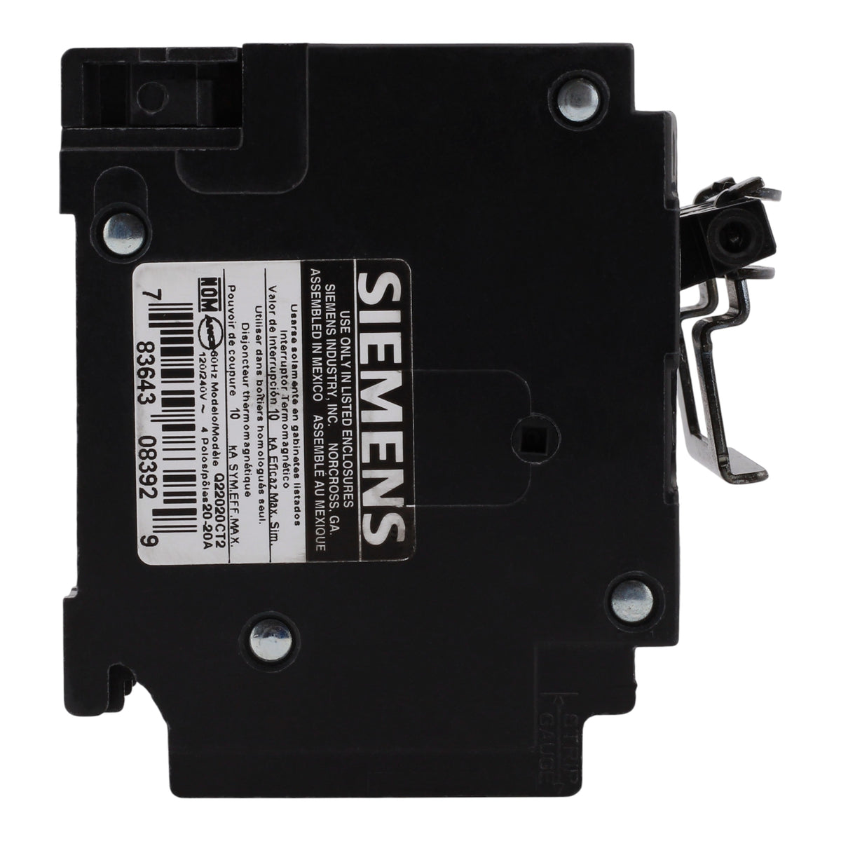Siemens Q22020CT2: 20 Amp 2-Pole Duplex (2x20A 1-Pole) Thermal Magnetic circuit breaker, 120/240V, 10kA interrupt rating, plug-in mounting, UL 489 listed.