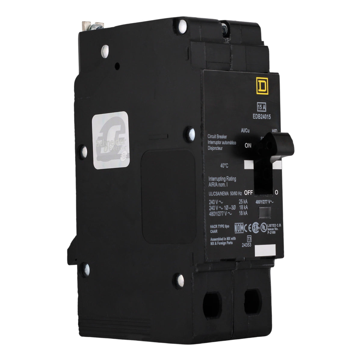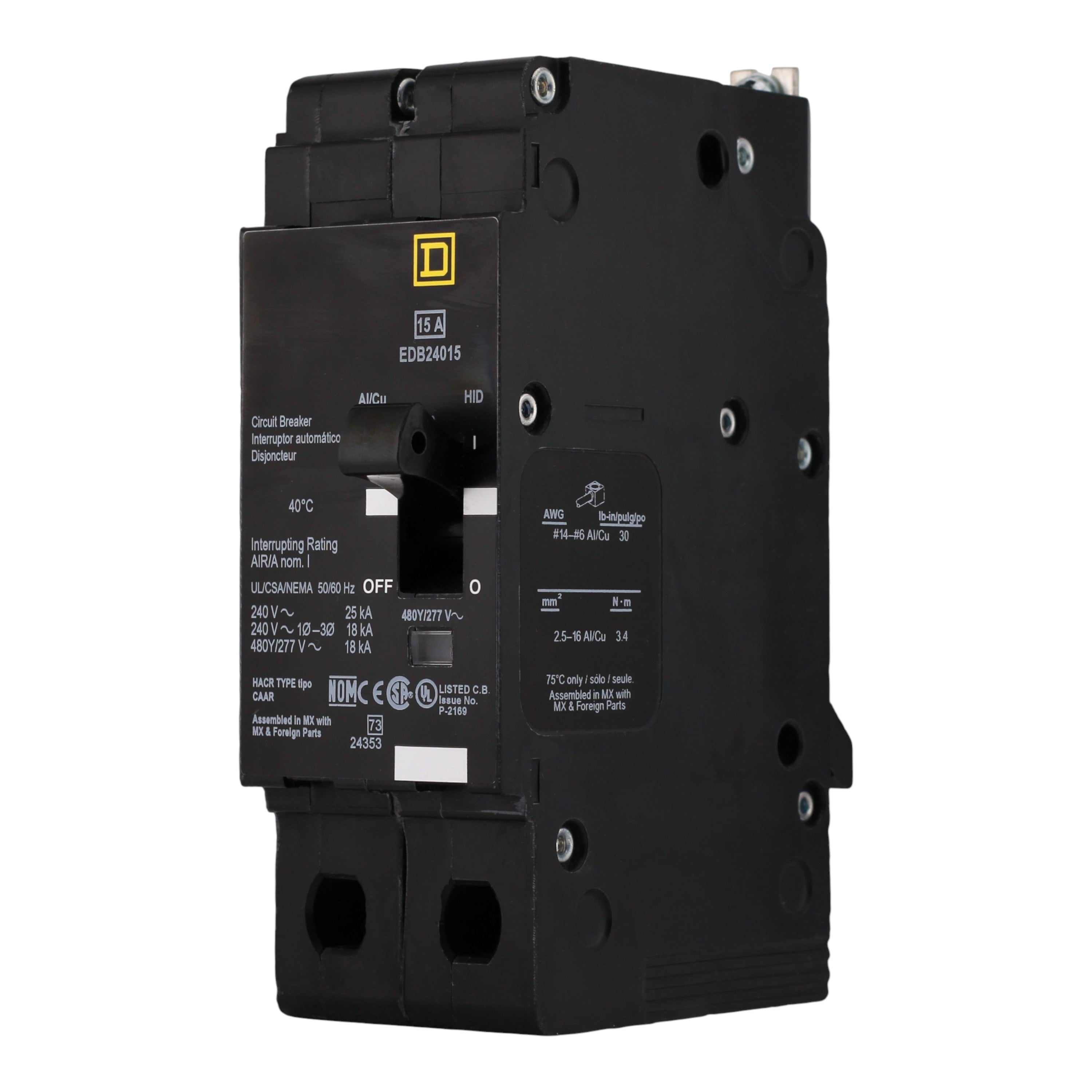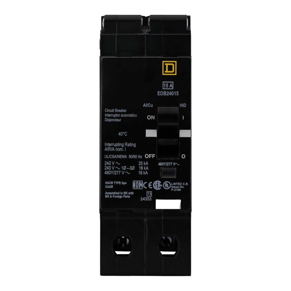 Square D EDB24015: 15 Amp 2-Pole Thermal-Magnetic Circuit Breaker, 480Y/277 VAC, 25kA Interrupt Rating at 240V/480Y/277V, Bolt-On, Visi-Trip Indicator, UL Listed, HACR & HID Rated