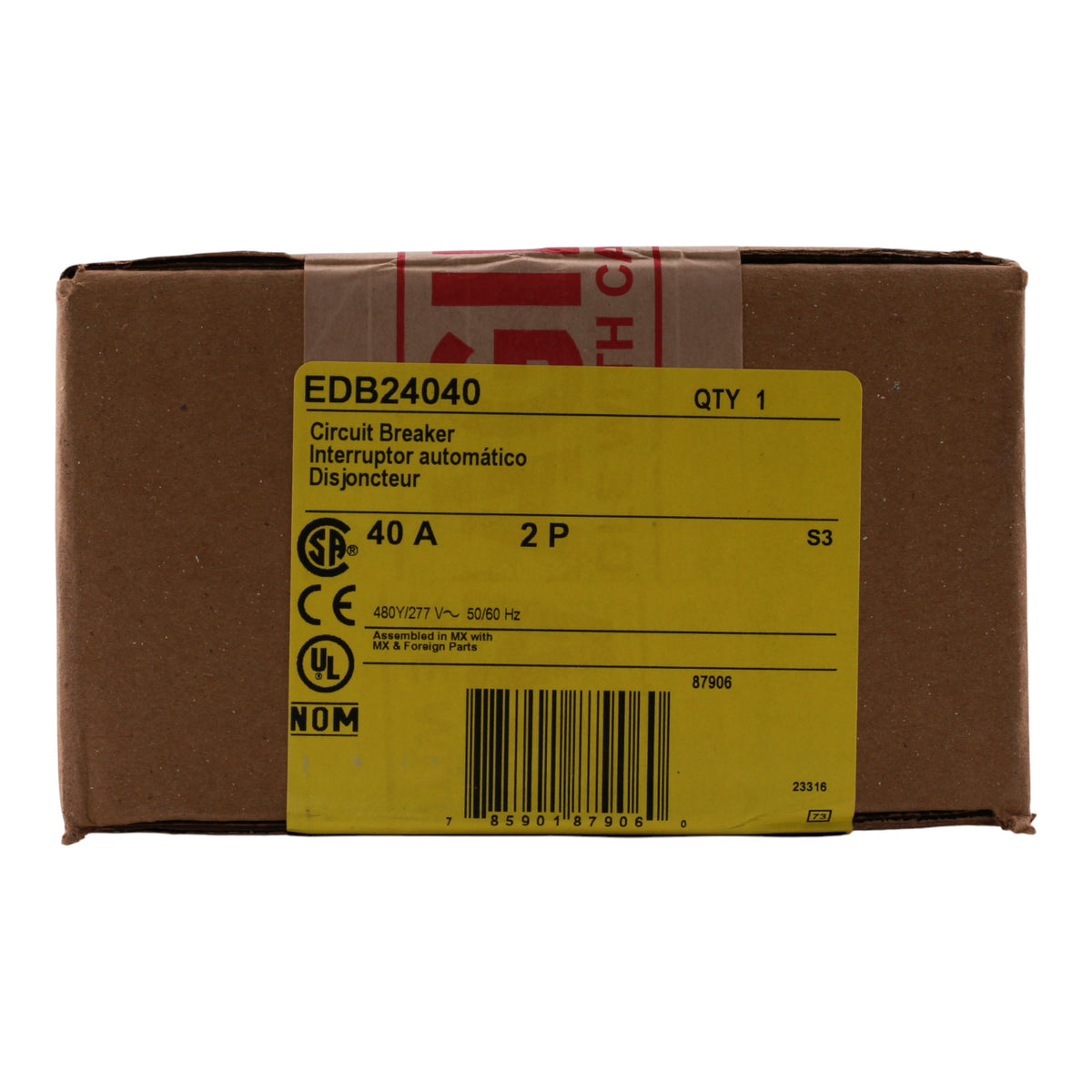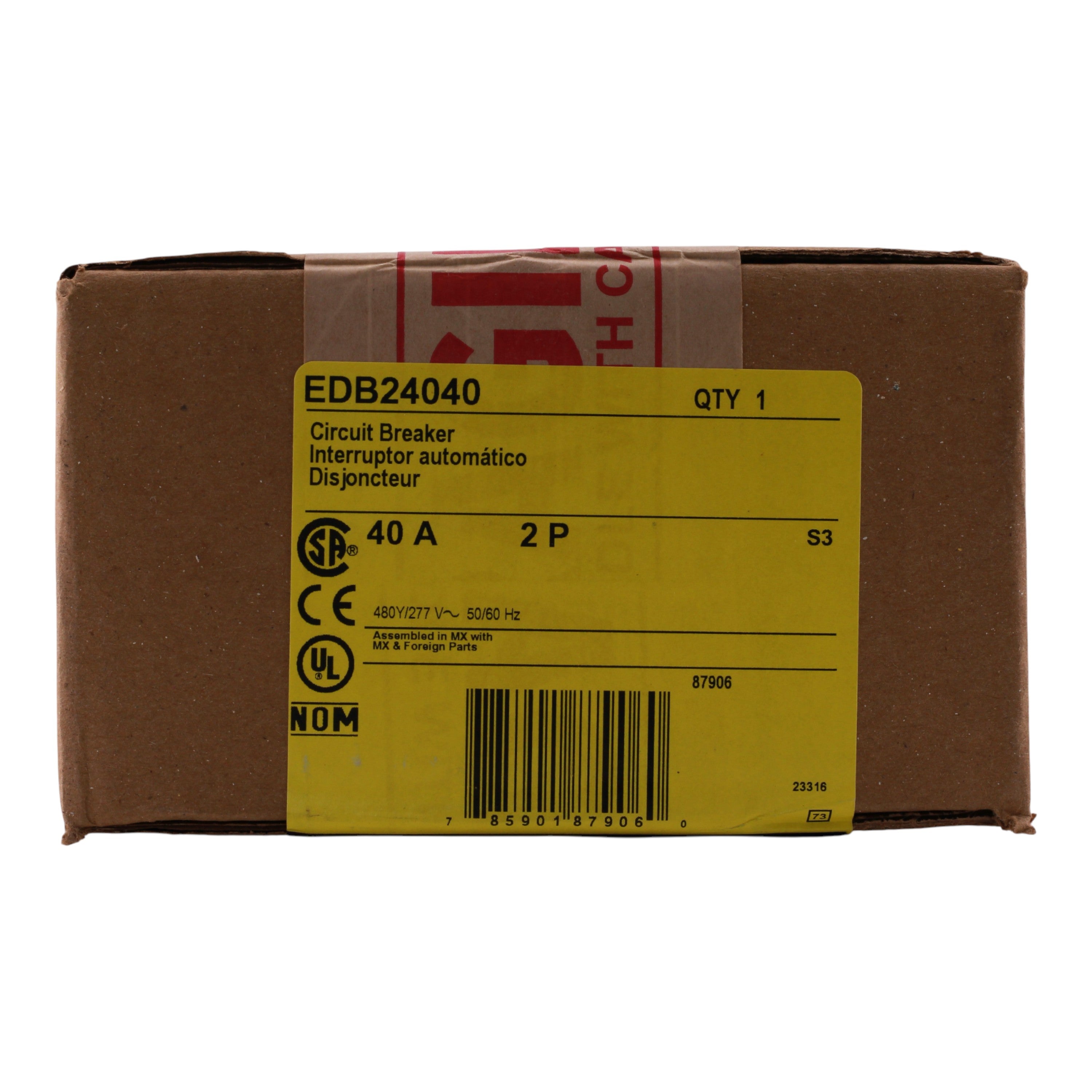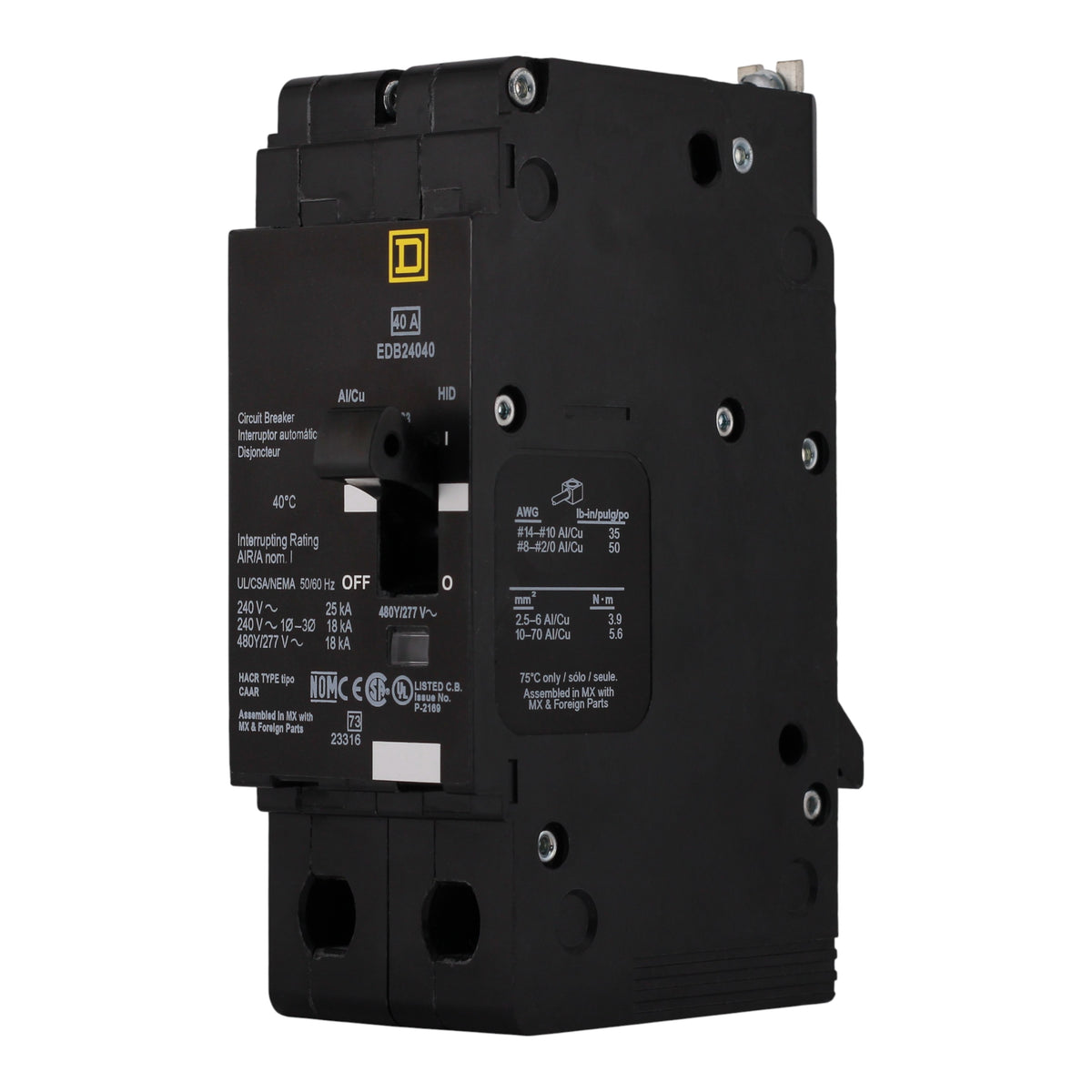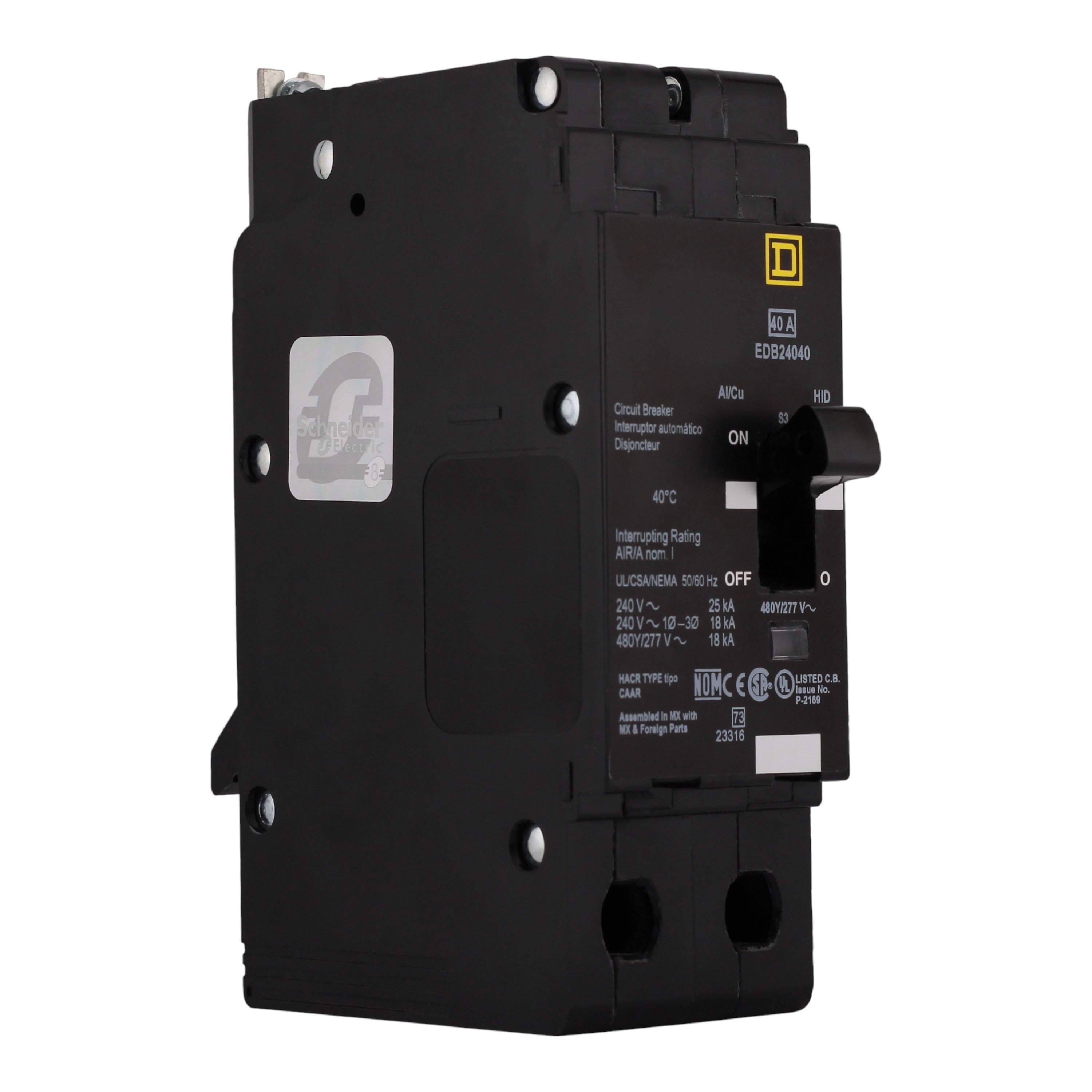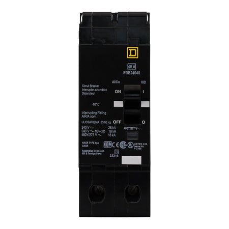 Square D EDB24040: 40 Amp 2-Pole Thermal-Magnetic Circuit Breaker, 480Y/277V AC, 25kA Interrupt Rating at 240V/480Y/277V, Bolt-On Mounting, Visi-Trip Indicator, UL Listed, HACR & HID Rated