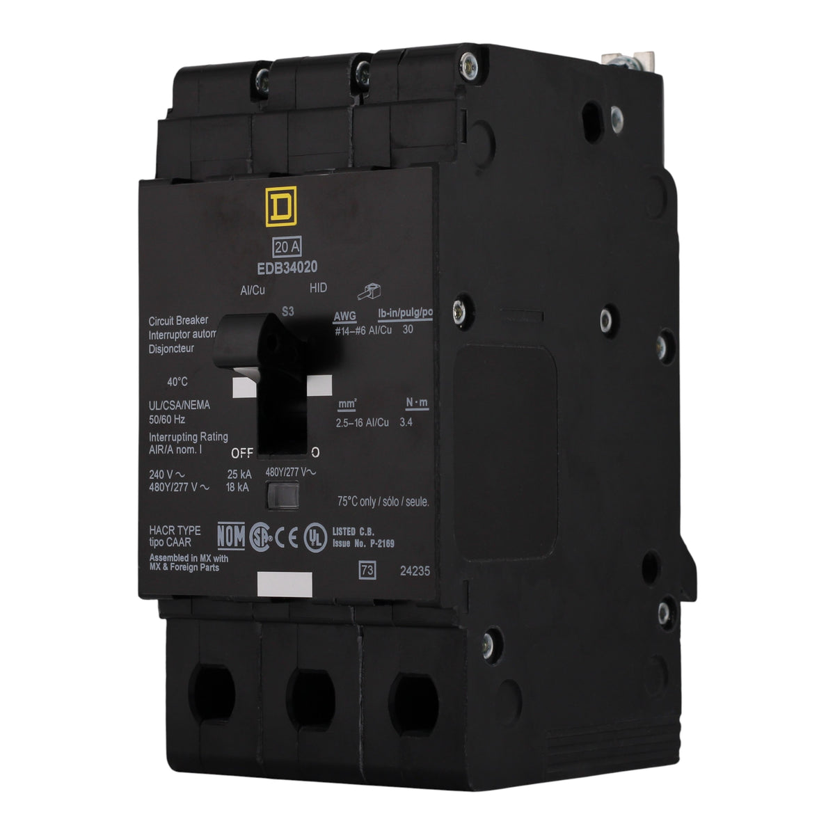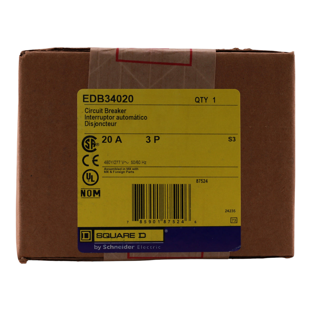 Square D EDB34020: 20 Amp 3-Pole thermal-magnetic circuit breaker, 480Y/277V, 25kA interrupt rating, bolt-on mounting, Visi-Trip indicator, UL listed.