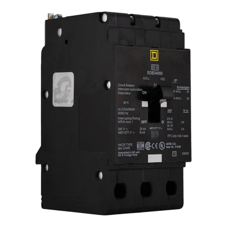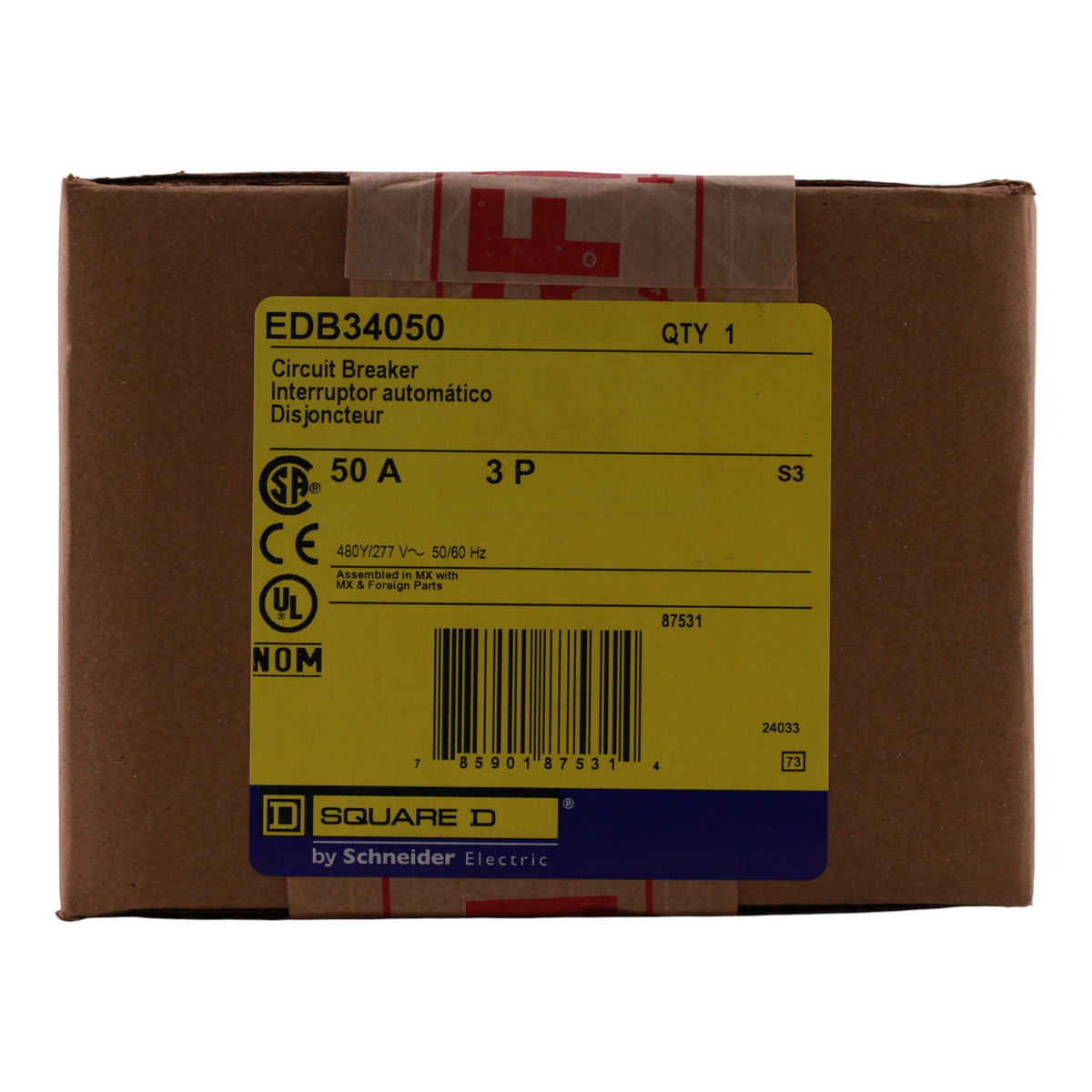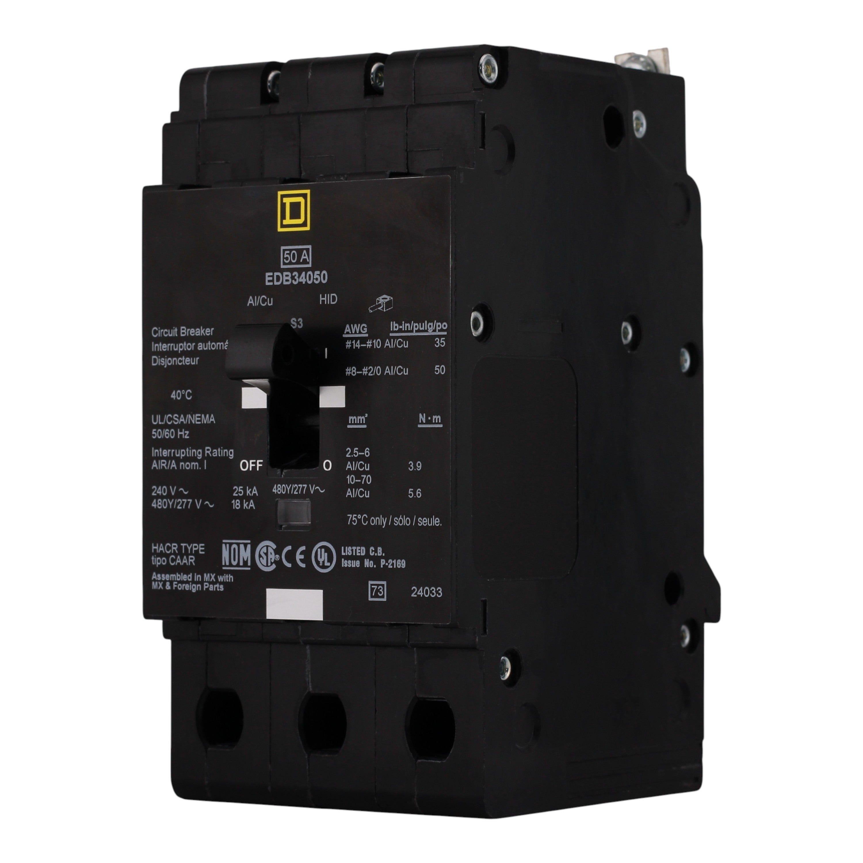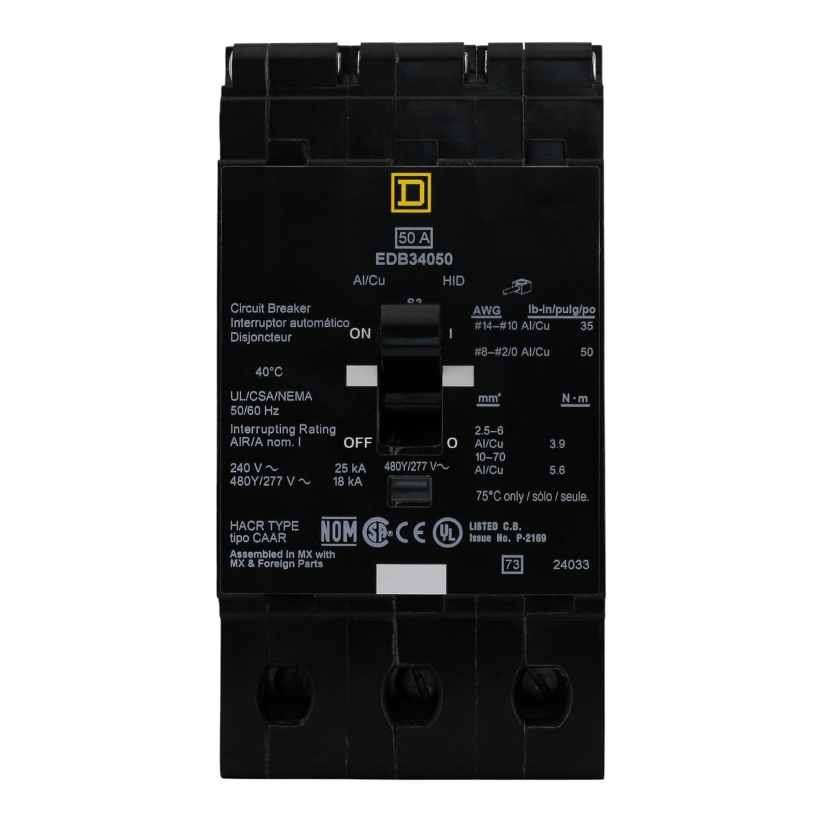 Square D EDB34050: 50 Amp 3-Pole thermal-magnetic circuit breaker, 480Y/277V, 25kA interrupt rating at 240V (18kA at 480Y/277V), bolt-on mount, Visi-Trip indicator, UL/cULus listed.