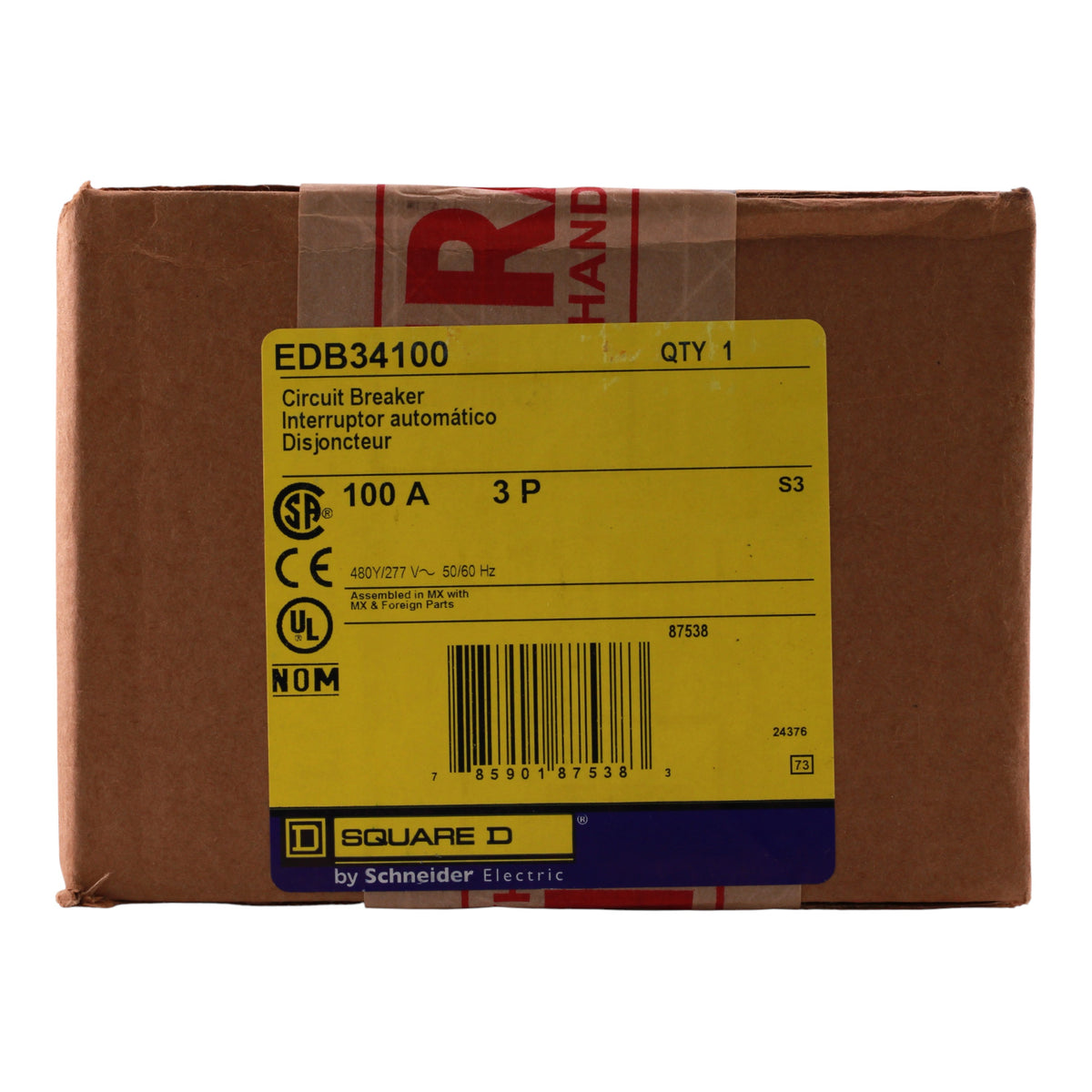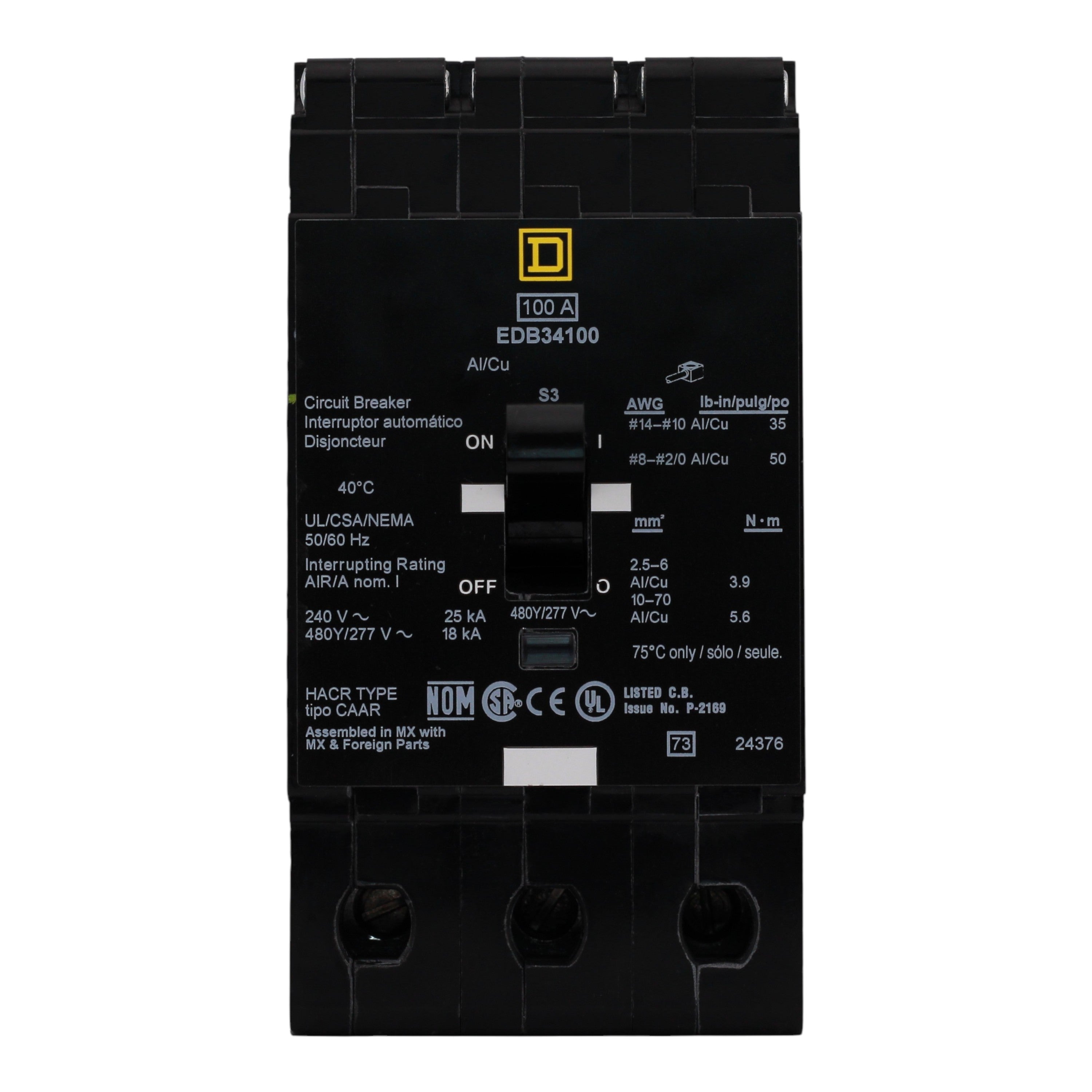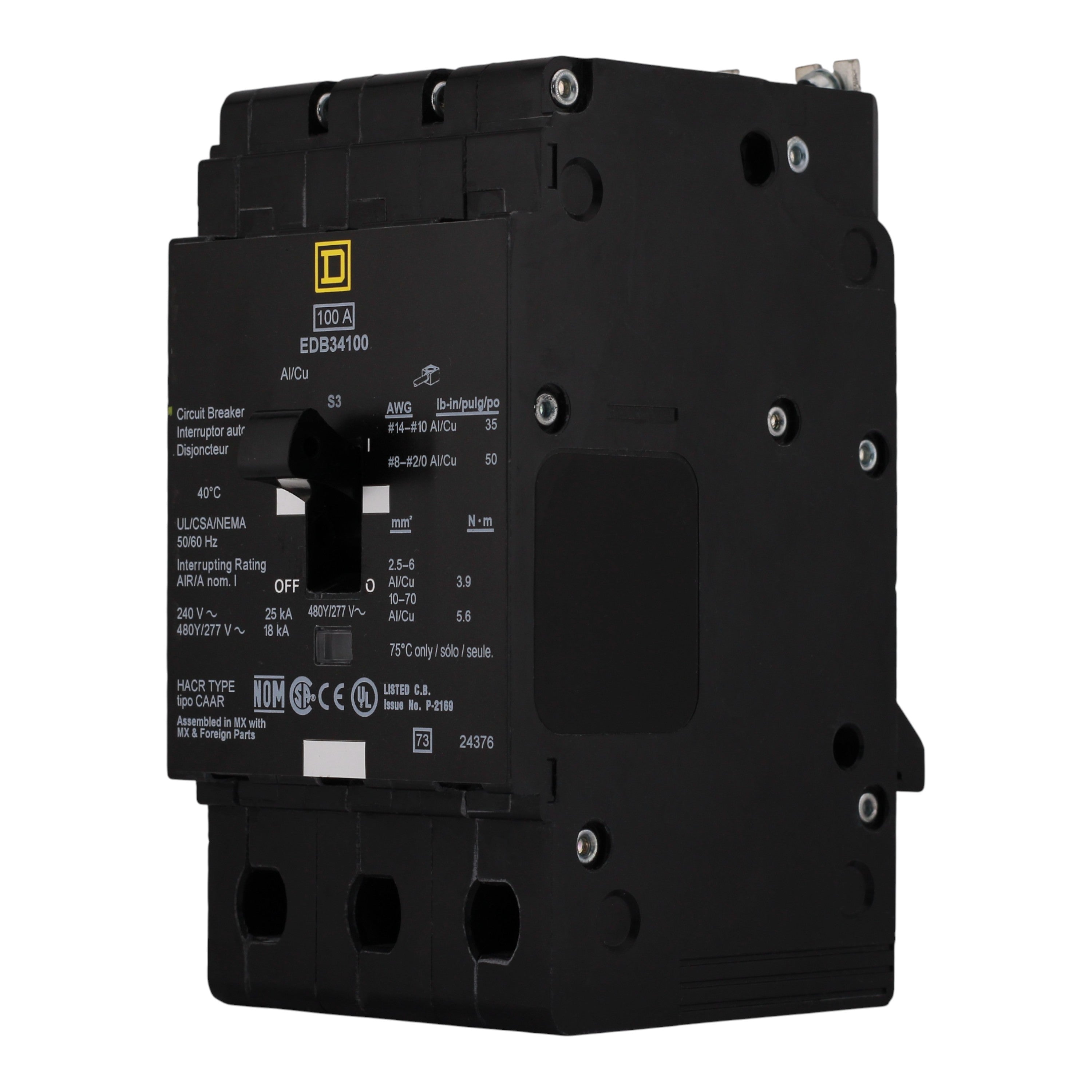 Square D EDB34100: 100 Amp 3-Pole Thermal-Magnetic circuit breaker, 480Y/277V AC, 25kA interrupt rating at 240V/277V, 18kA at 480Y/277V, bolt-on mounting, Visi-Trip indicator, UL listed.
