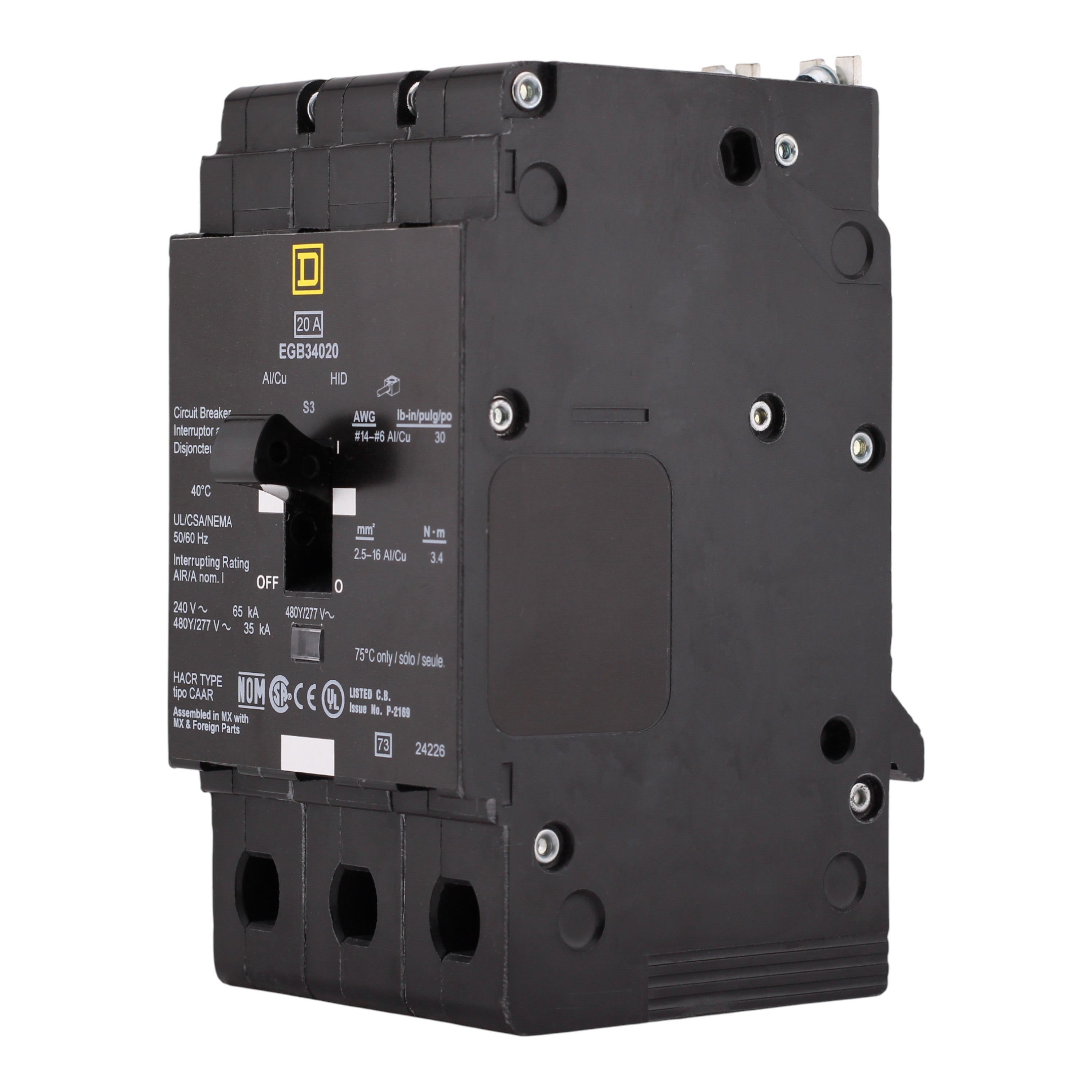 Square D EGB34020: 20 Amp, 3-Pole thermal-magnetic molded case circuit breaker, 480Y/277VAC, 35kAIC, bolt-on mounting, VISI-TRIP indicator, UL listed, HACR rated, TAA compliant.