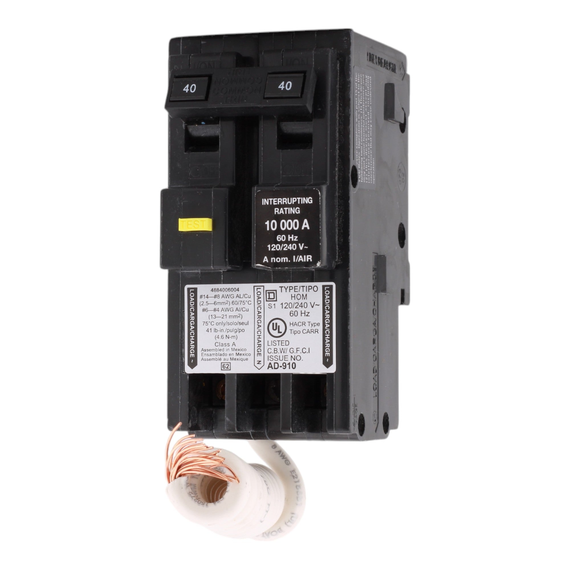 Square D HOM240GFI: 40A 2P GFCI breaker, 120/240V, 10kA SCCR, Class A ground fault protection (6mA), plug-in mount for Homeline panels, UL listed, HACR rated.