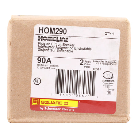 This Square D HOM290 plug-in circuit breaker provides reliable 90A, 2-pole standard protection for 120/240V circuits in Homeline loadcenters. Engineered for fast installation and superior circuit protection, it ensures dependable performance for residential and light commercial applications.