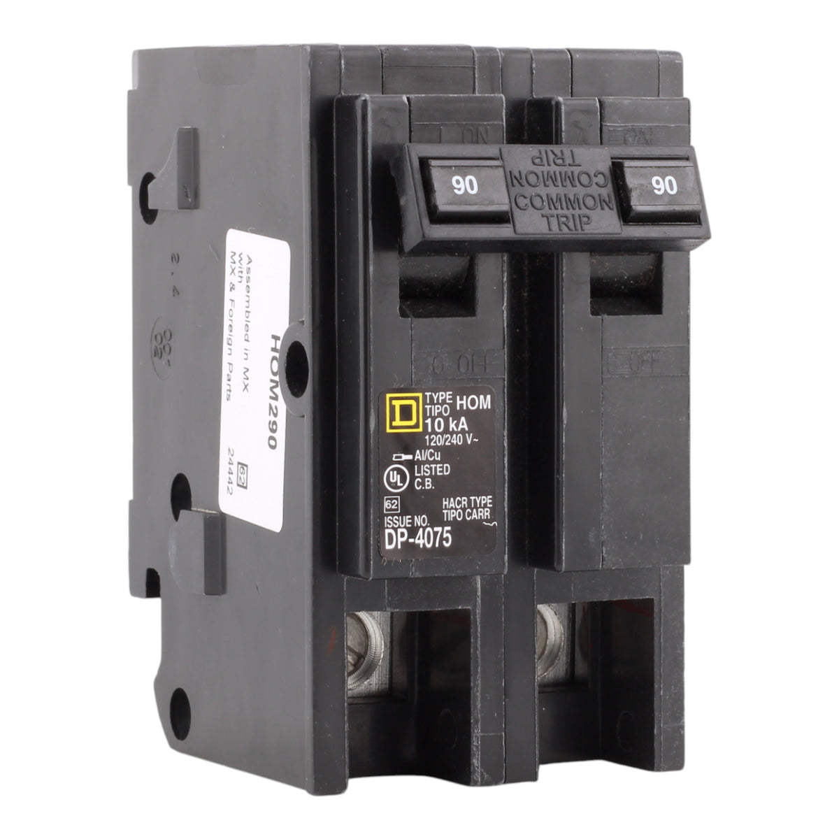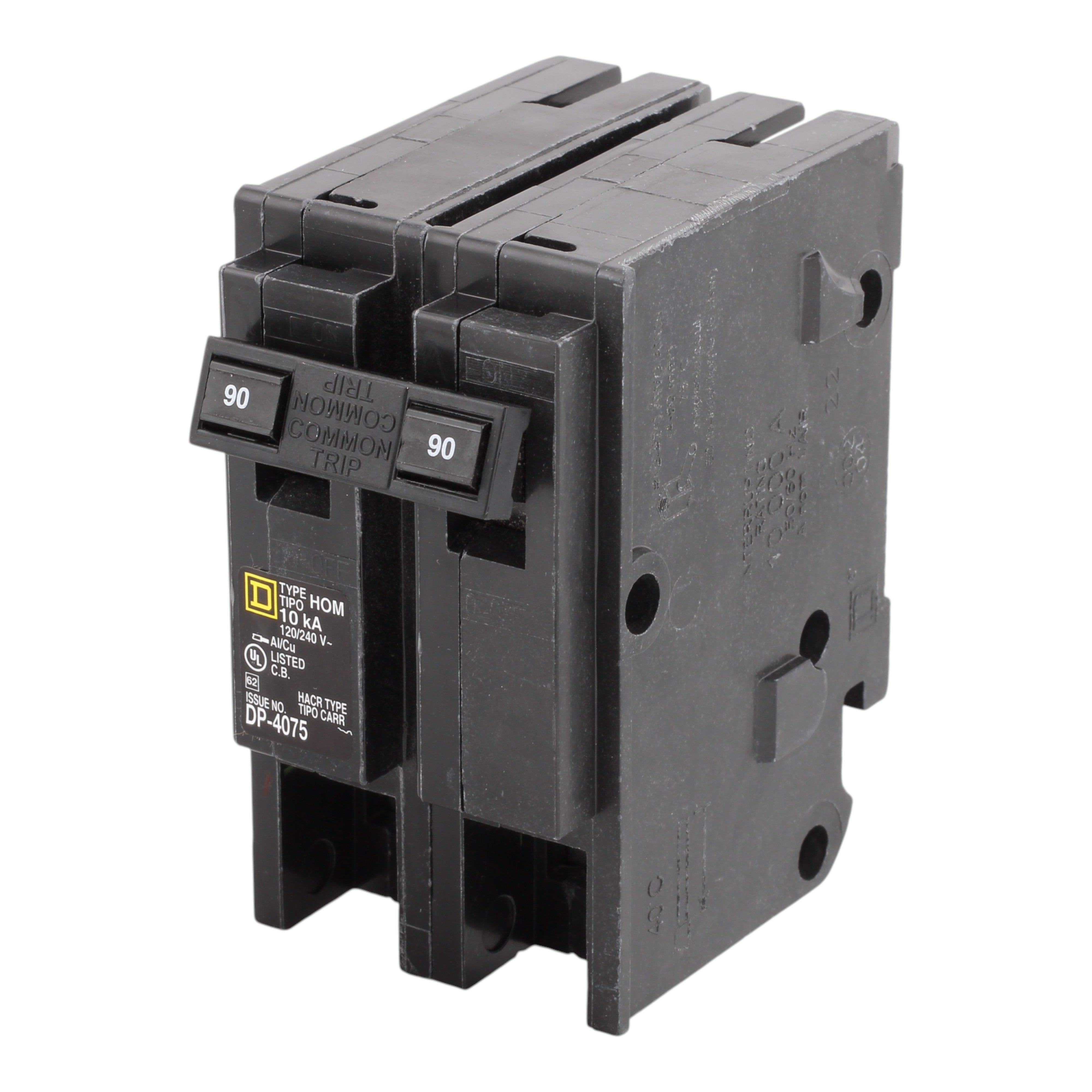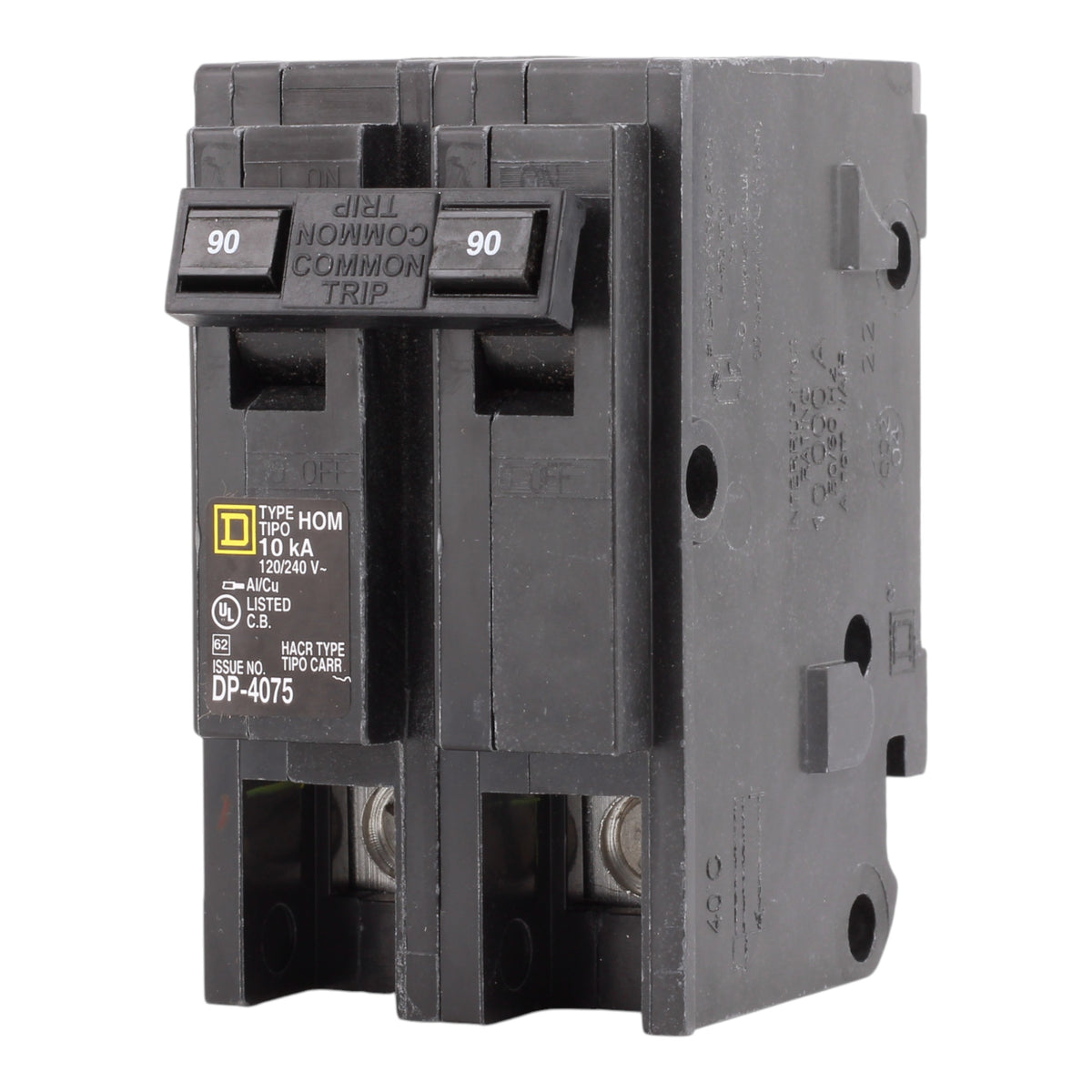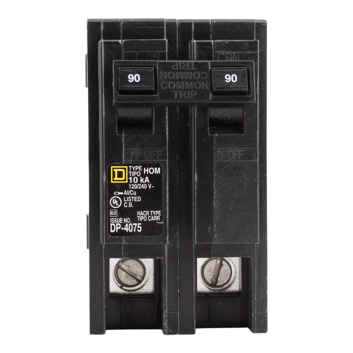 Square D HOM290: 90 Amp 2-Pole Standard Circuit Breaker, 120/240V, 10kA, plug-in, UL listed, HACR rated.