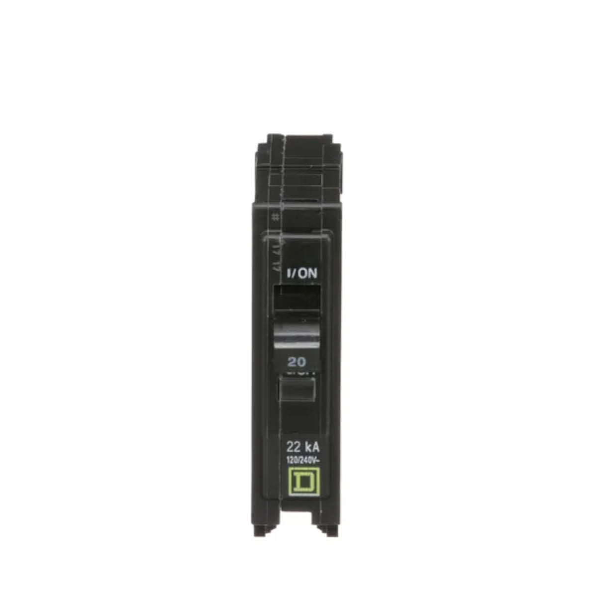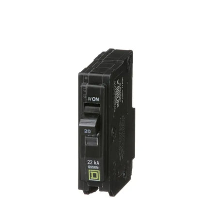Square D QO120VH: 20 Amp 1-Pole standard thermal-magnetic circuit breaker, 120/240V, 22kA, plug-in mount, UL listed.