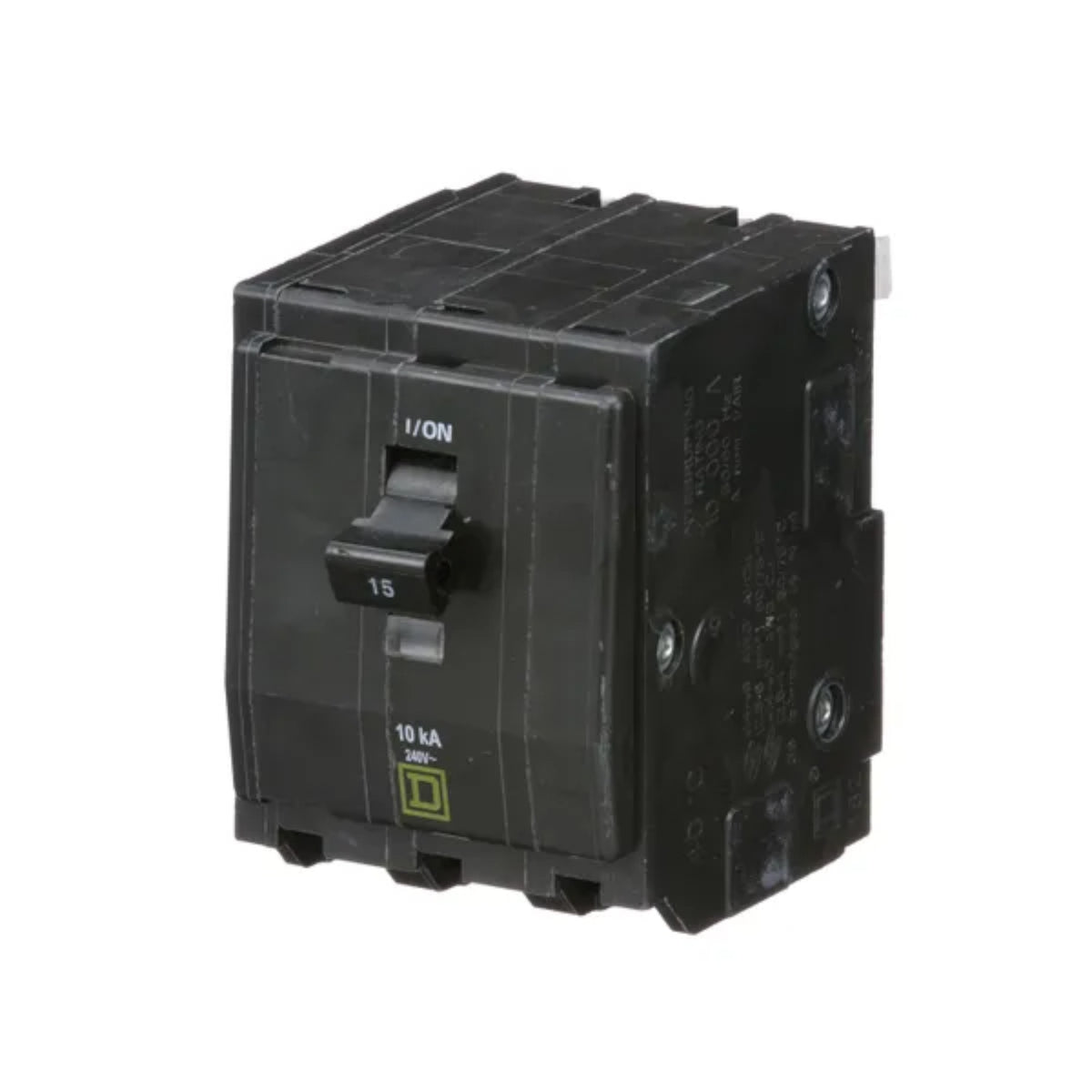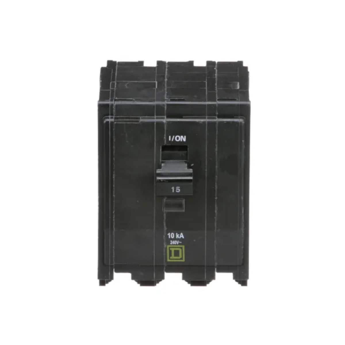 Square D QO315: 15 Amp 3-Pole standard thermal-magnetic circuit breaker, 120/240V, 10kA, plug-on connection, UL listed.