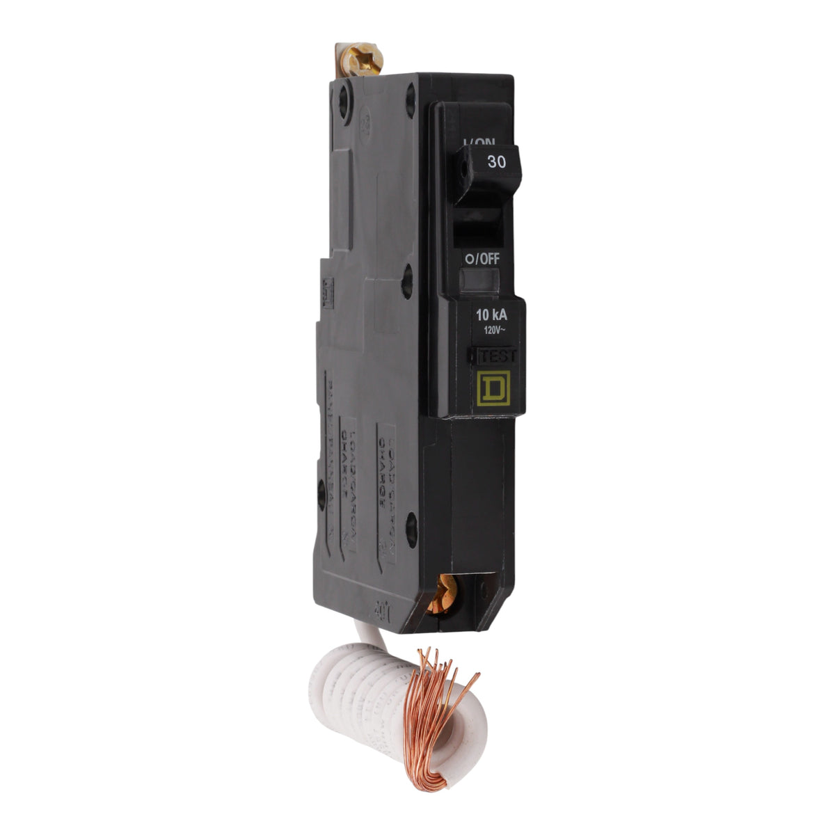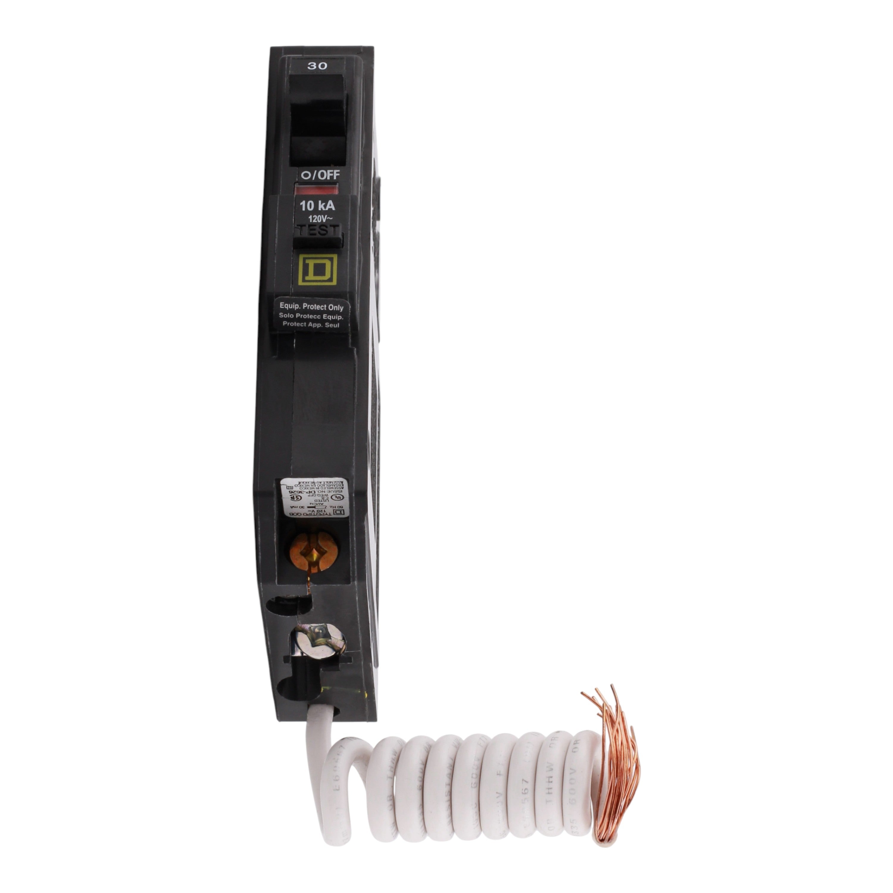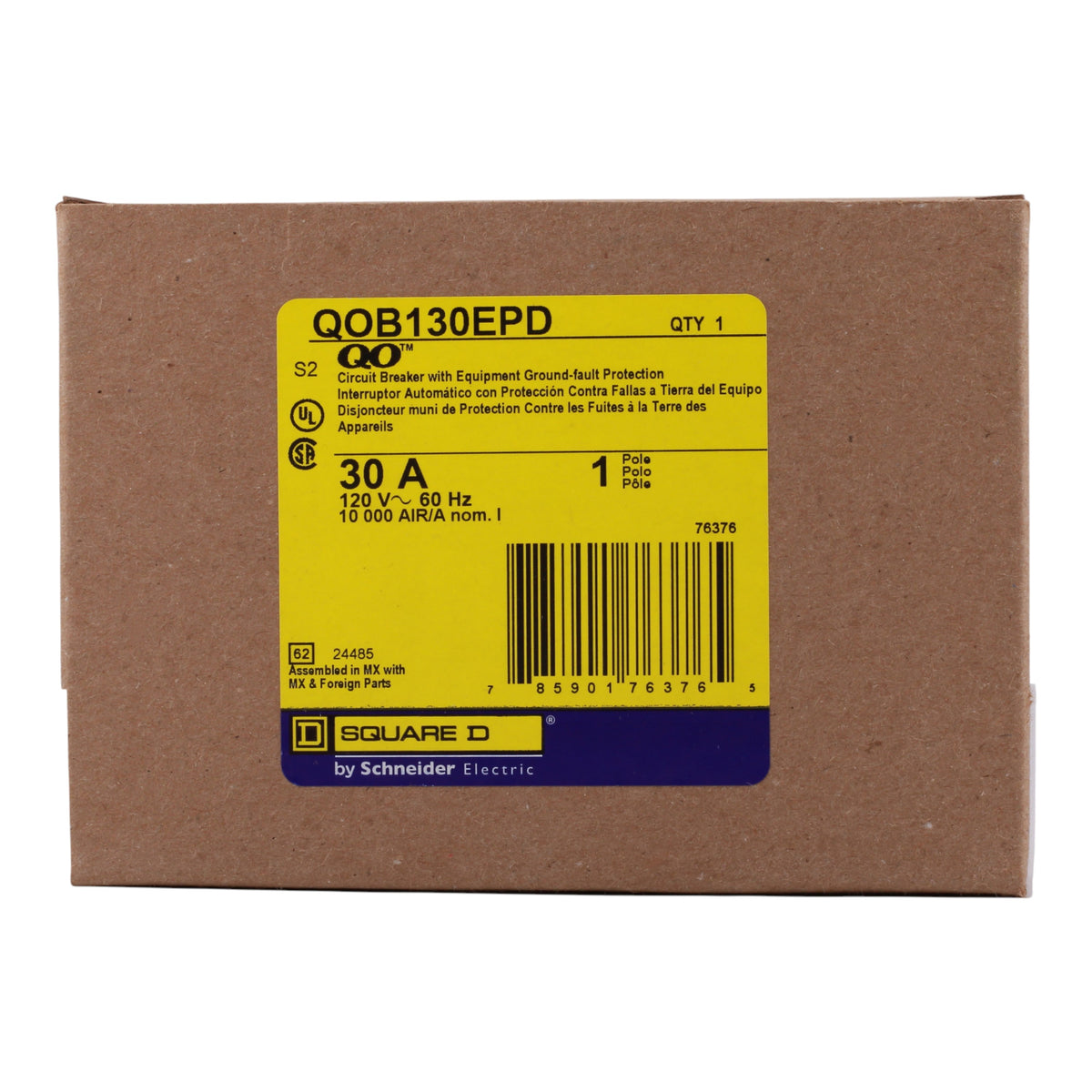 Square D QOB130EPD: 30 Amp 1-Pole GFCI Ground-Fault Circuit Interrupter breaker, 120V, 10kA, bolt-on mount, Class B 30mA trip sensitivity, UL listed, CSA certified.