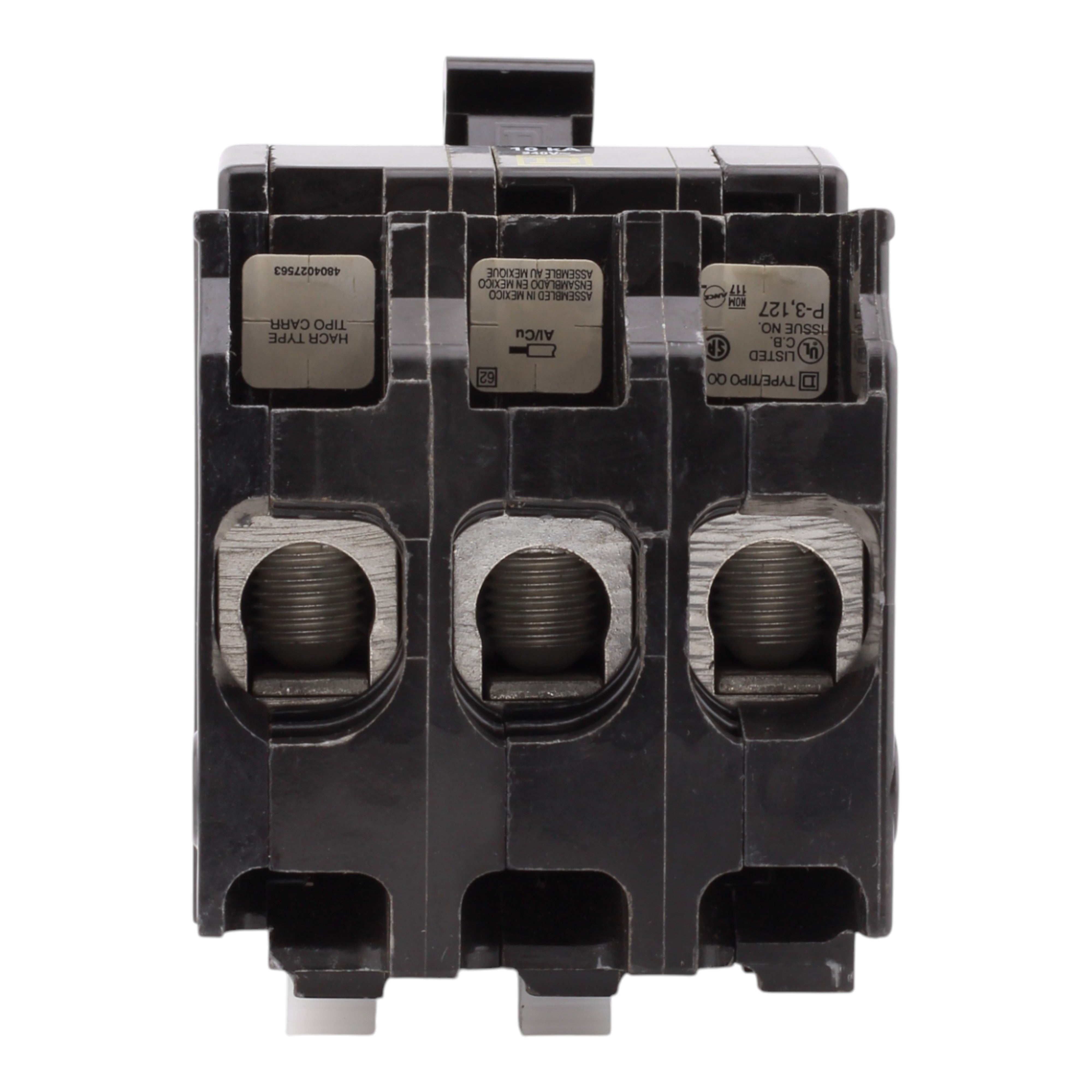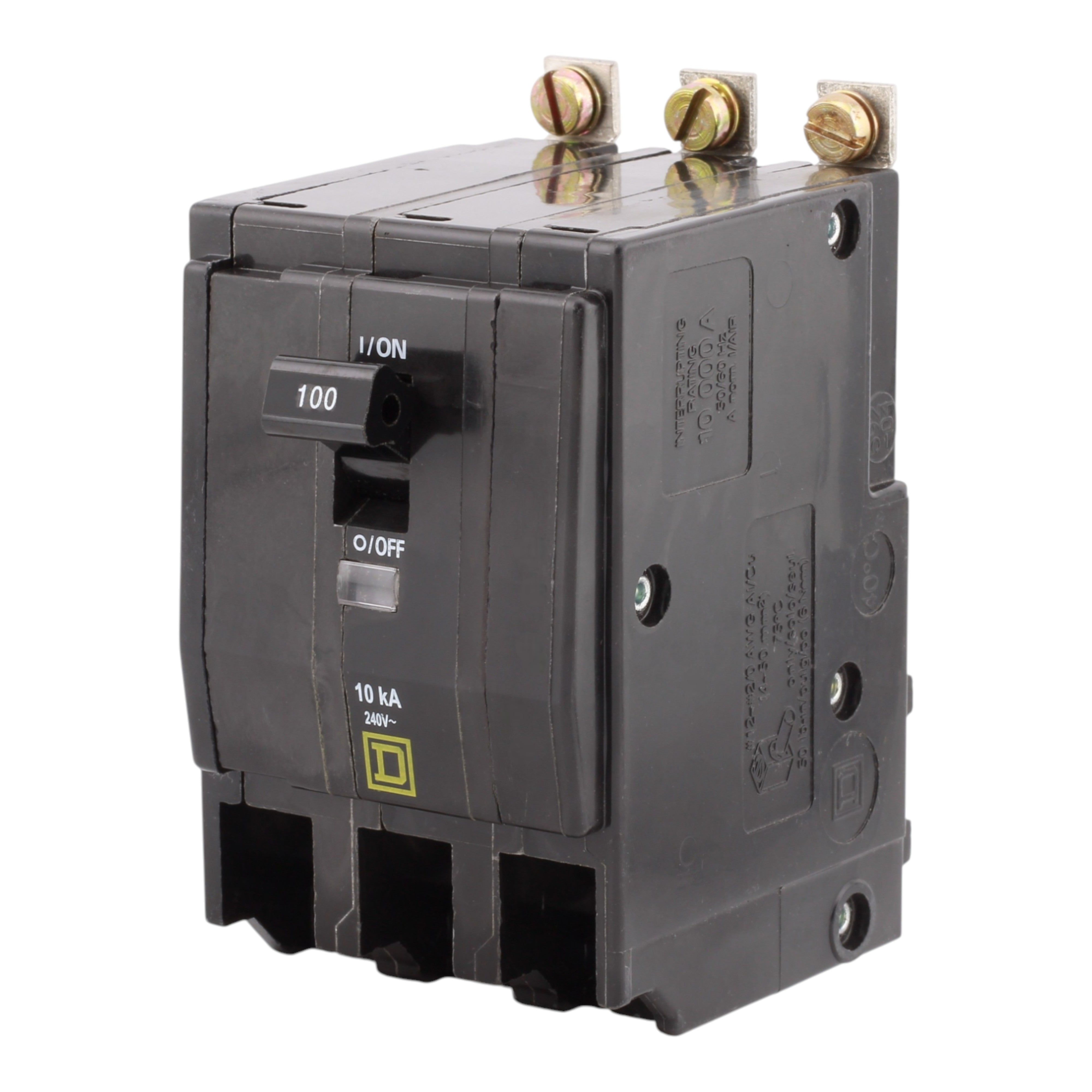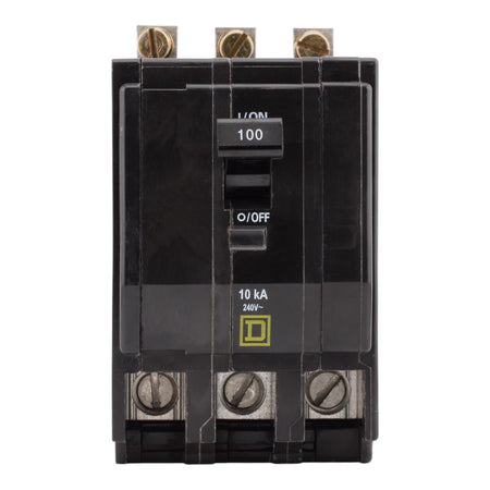 Square D QOB3100: 100 Amp 3-Pole Standard Circuit Breaker, 120/240V, 10kA, bolt-on, UL listed, CSA certified.