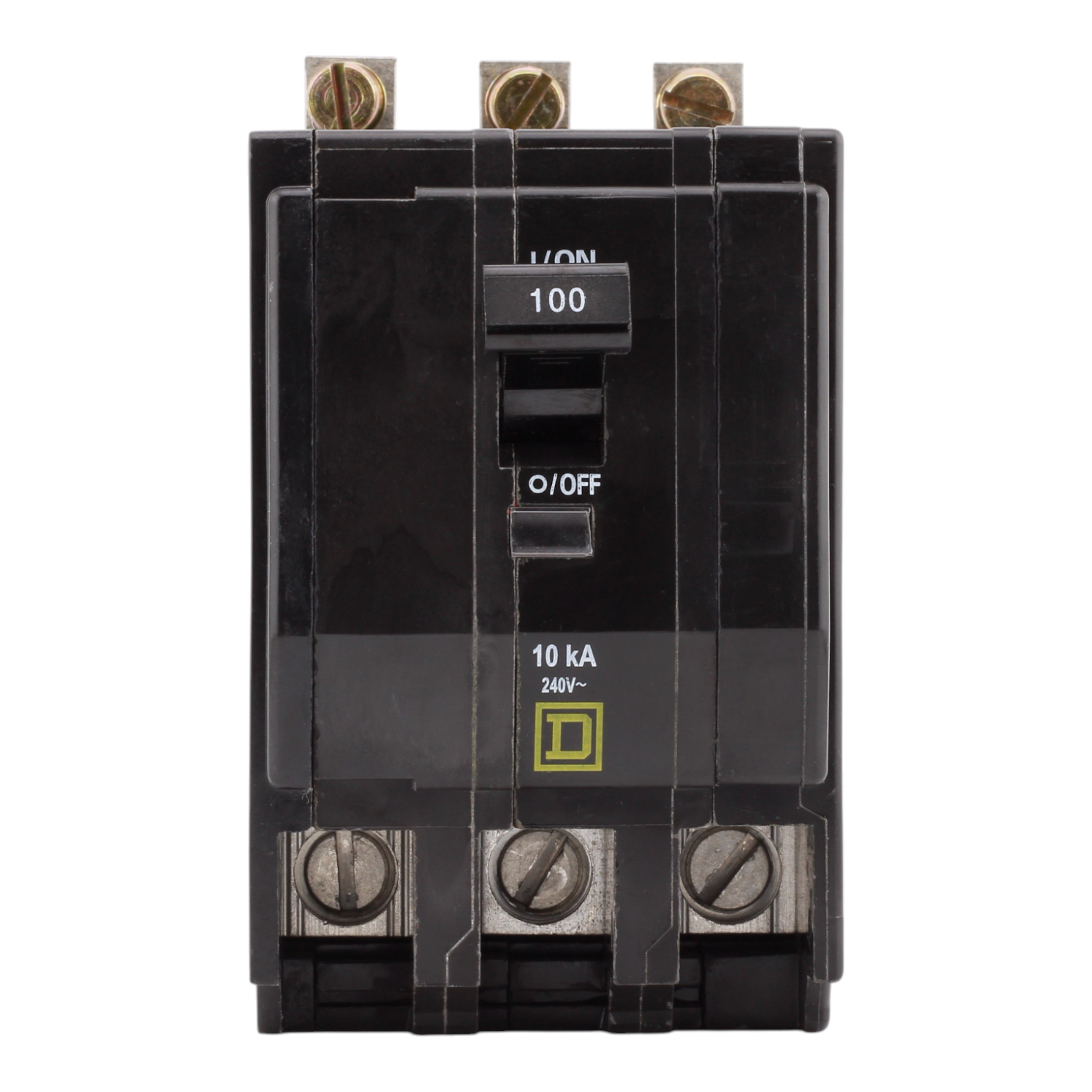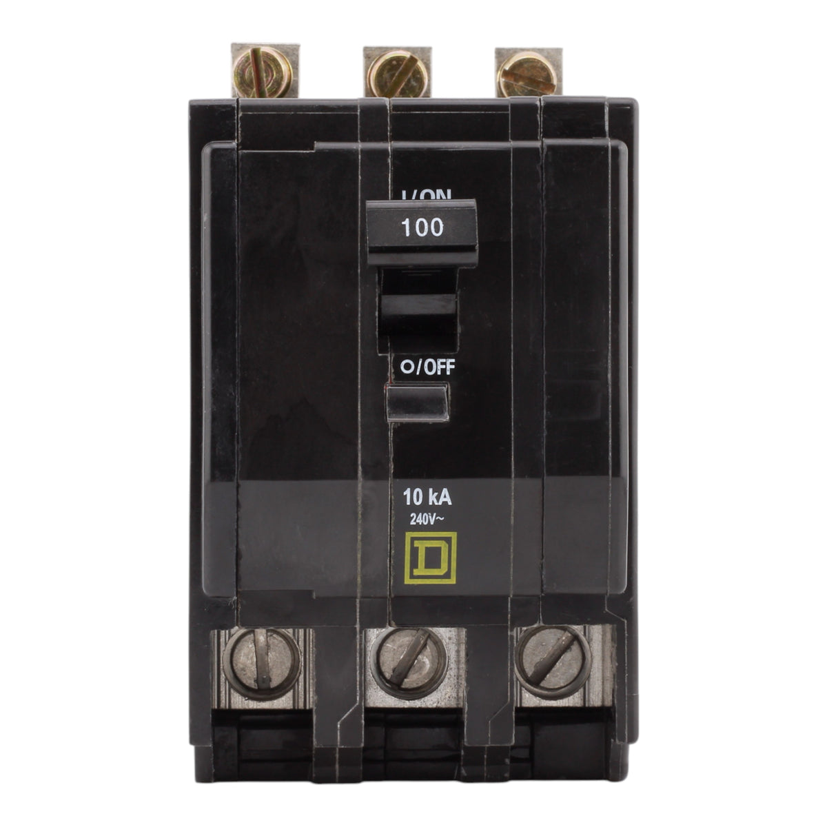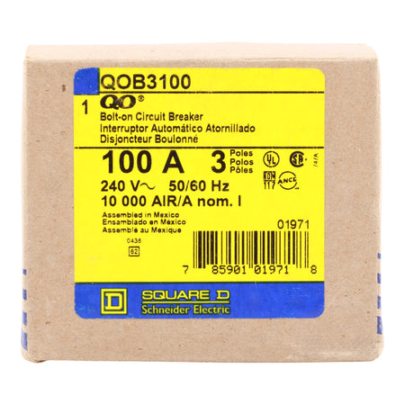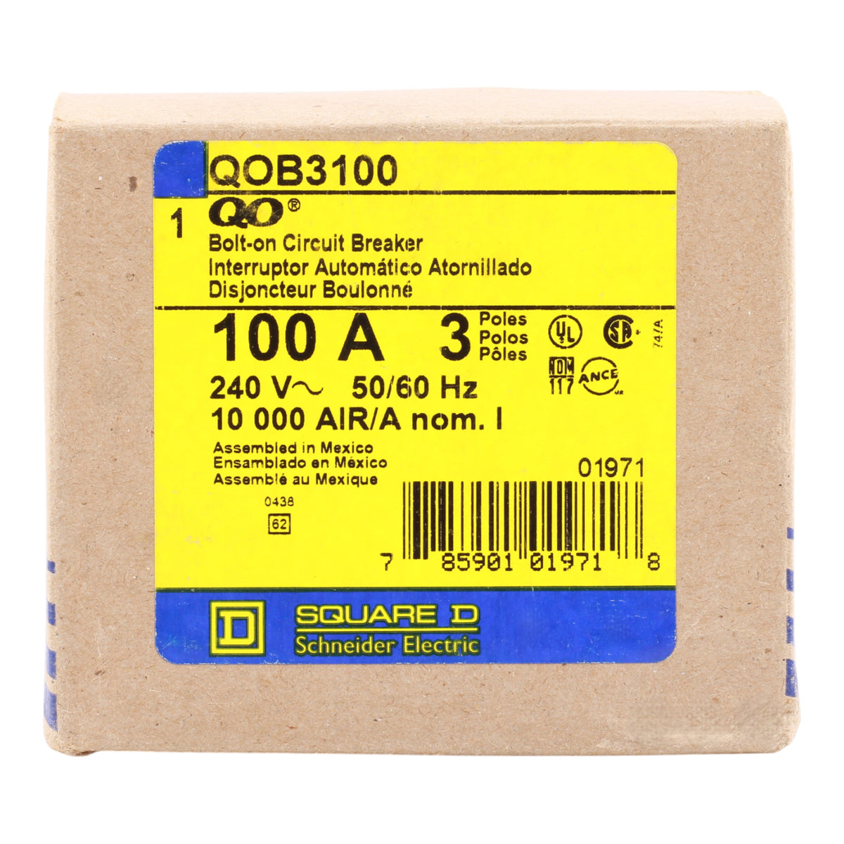 This Square D QOB3100 bolt-on circuit breaker provides reliable 100A, 3-pole protection for 120/240V circuits in QO loadcenters. With a 10kA interrupt rating, it ensures robust overcurrent protection and switching for residential and commercial applications.