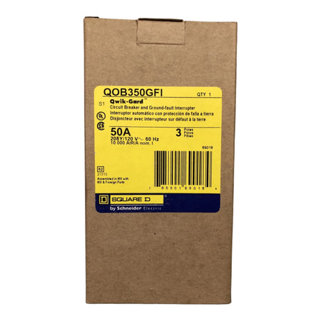 Square D QOB350GFI: 50 Amp, 3-Pole, Ground-Fault Circuit Interrupter breaker, 208Y/120V, 10kA, bolt-on mounting, pigtail neutral, 6mA trip sensitivity, UL listed.