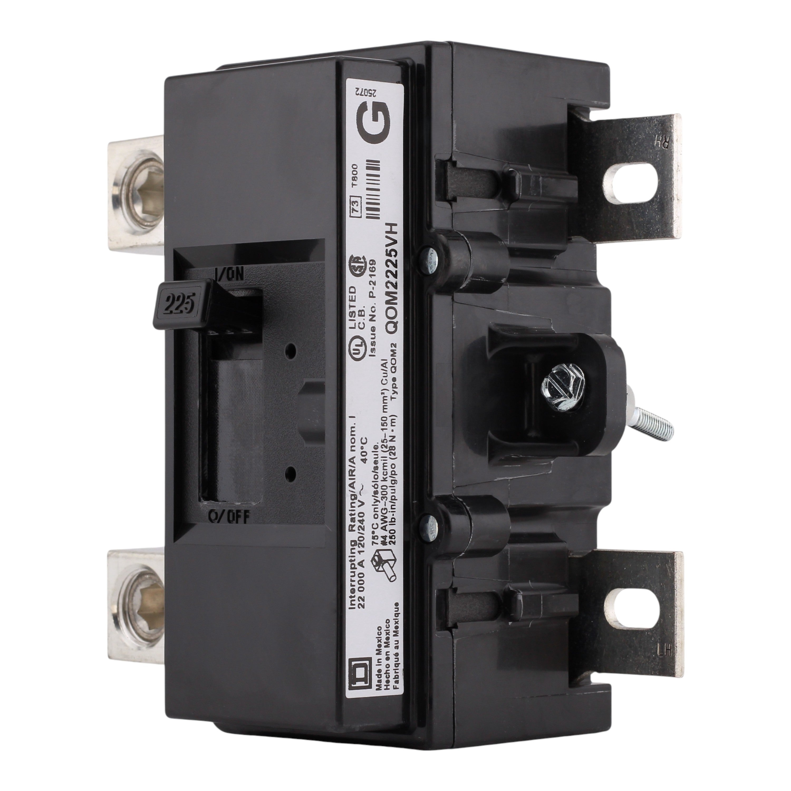 Square D QOM2225VH: 225 Amp 2-Pole Main Circuit Breaker, 120/240V AC, 22kA interrupting rating, bolt-on mounting, thermal-magnetic trip, UL Listed for QO load centers.