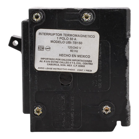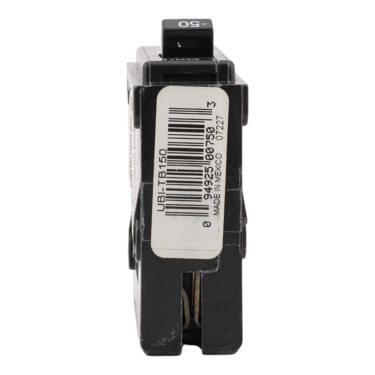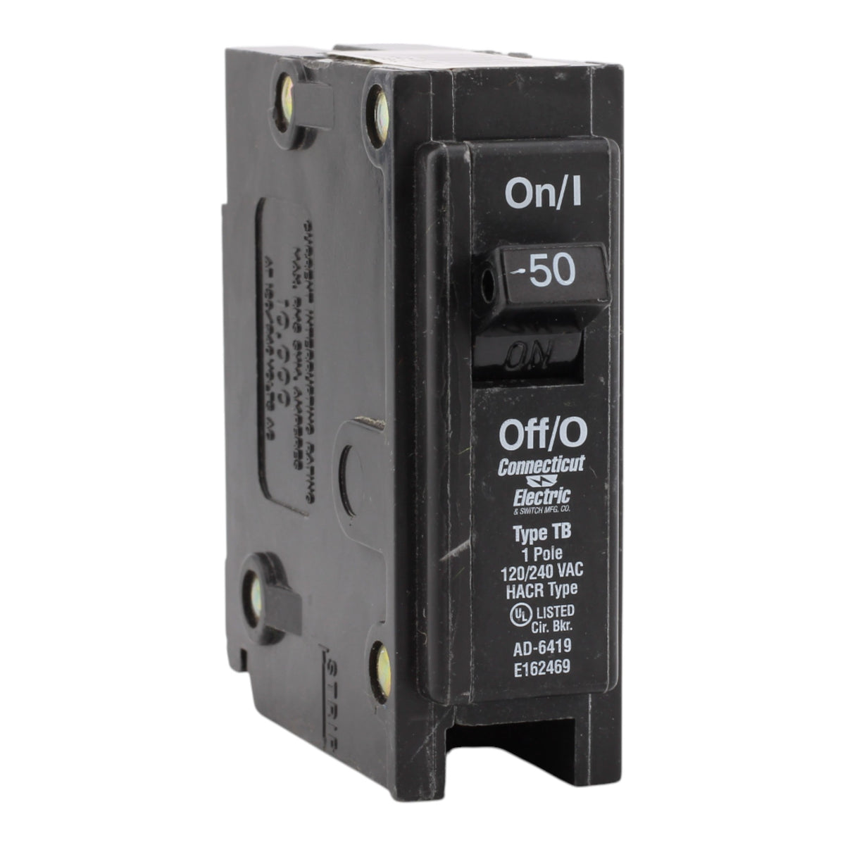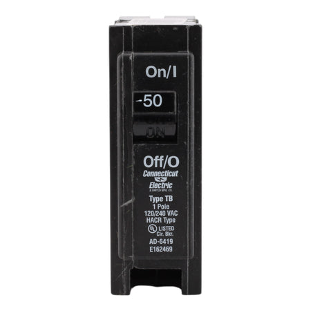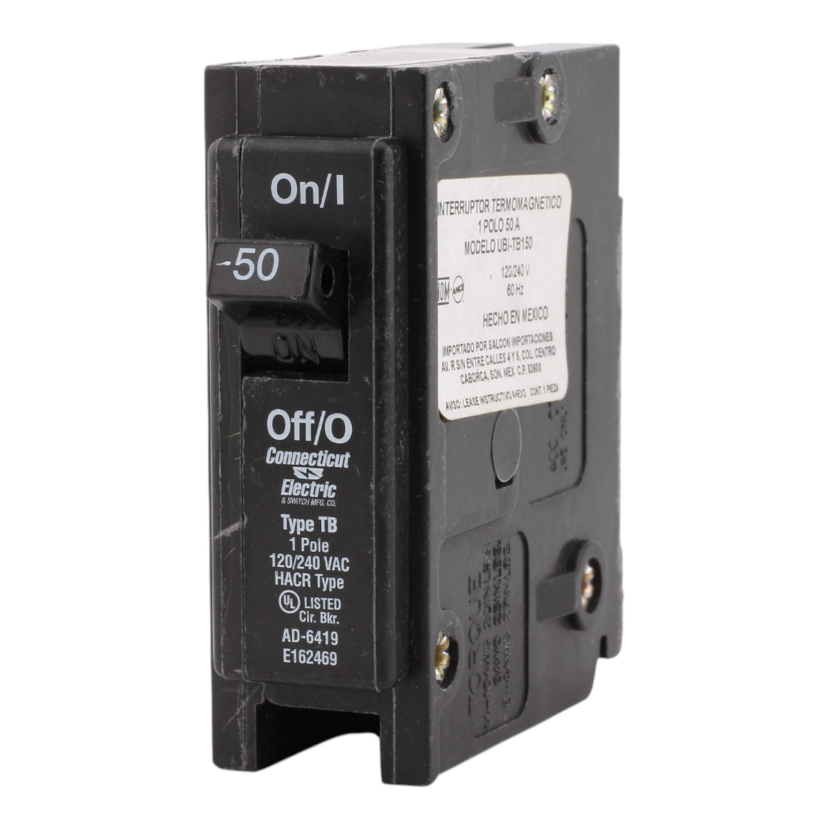 Connecticut Electric UBITB150: 50A 1P molded case breaker, 240V, 10kA@120V, plug-in, thermal magnetic protection, TB Series.
