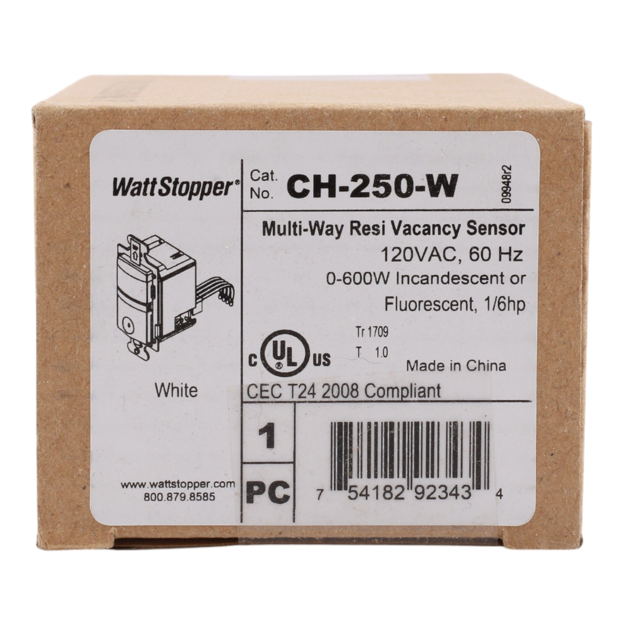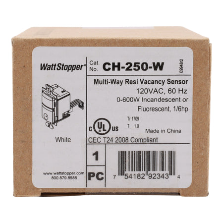 Wattstopper CH-250-W: Multi-way PIR vacancy sensor, 600W, 120V, manual-on/auto-off, 180° coverage up to 600 sq ft, California Title 24 compliant, adjustable time delay.